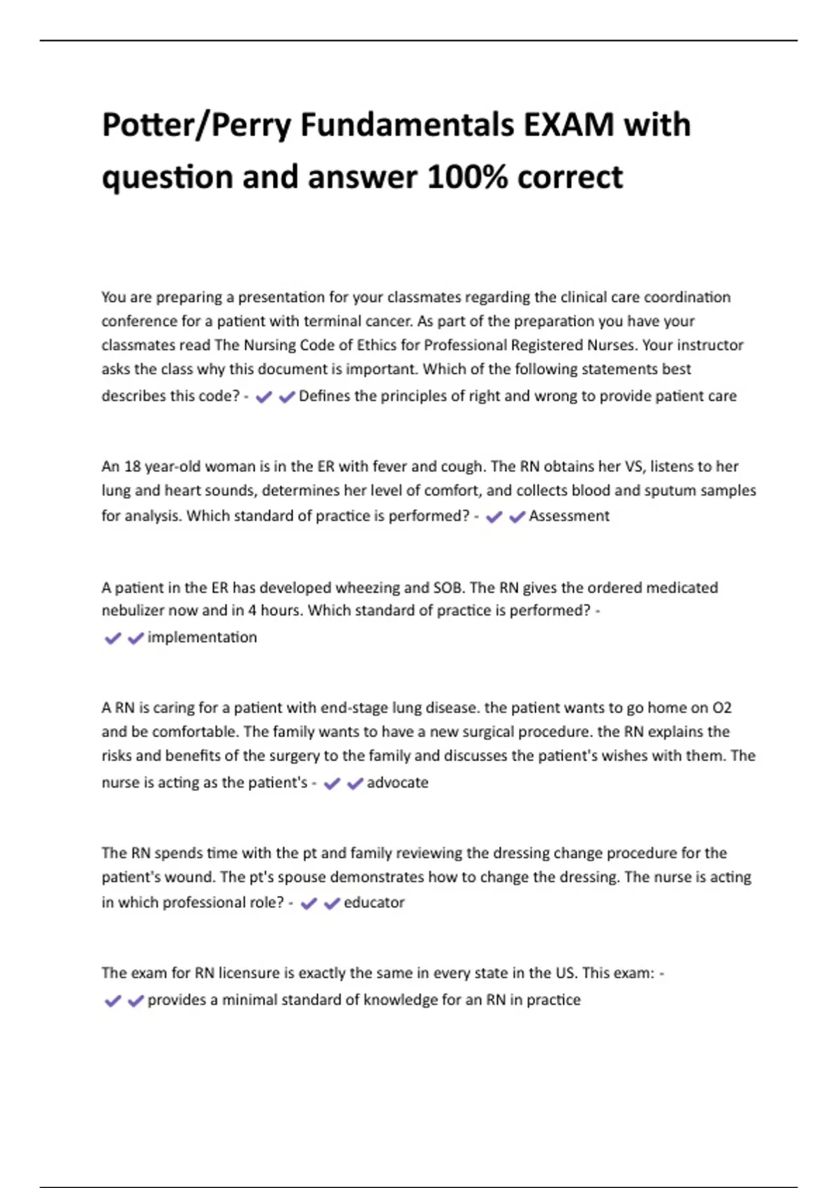 Potter/Perry Fundamentals EXAM with question and answer 100% correct