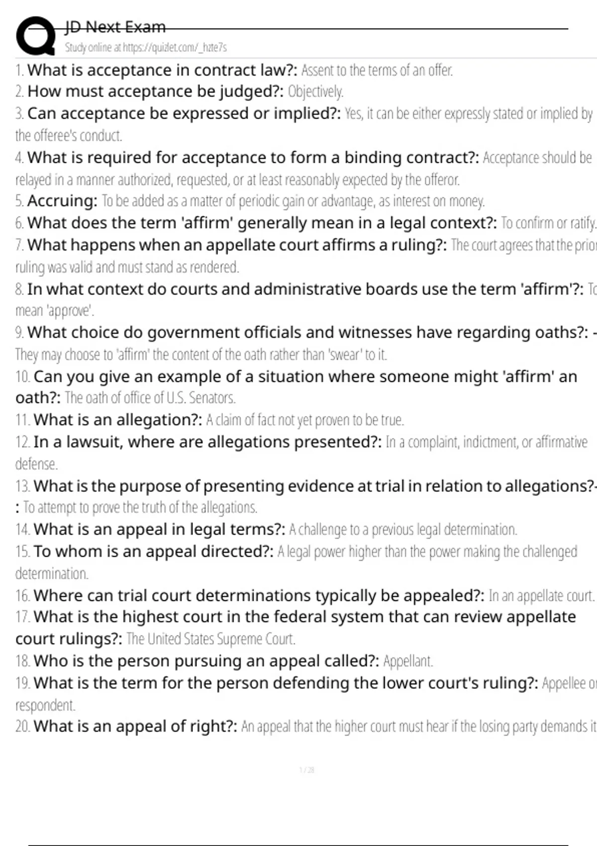 1. What is acceptance in contract law?: Assent to the terms of an offer.