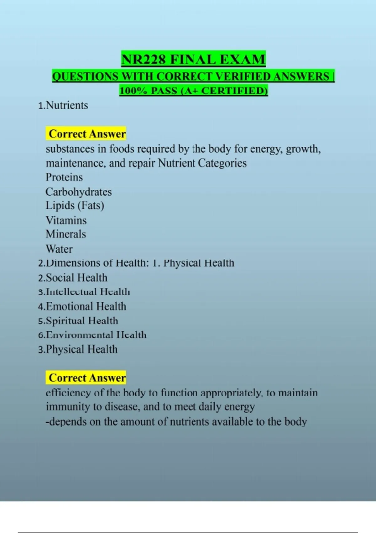NR228 FINAL EXAM QUESTIONS WITH CORRECT VERIFIED ANSWERS | 100% PASS (A+ CERTIFIED) 1. Nutrients Correct Answer substances in foods required by the body for energy, growth, maintenance, and repair Nutrient Categories Proteins Carbohydrates Lipids (Fats) Vitamins Minerals Water 2. Dimensions of Health: 1. Physical Health 2. Social Health 3. Intellectual Health 4. Emotional Health 5. Spiritual Health 6. Environmental Health 3. Physical Health Correct Answer efficiency of the body to function appropriately, to maintain immunity to disease, and to meet daily energy -depends on the amount of nutrients available to the body -body is composed of nutrients in various combinations and their distribution is highly individualized to meet the physical health needs individual 4. Intellectual Health Correct Answer use of intellectual abilities to learn and to adapt to changes in one's -Nutritional imbalances can affect intellectual health, as occurs with iron-deficiency anemia(lack of iron-rich food consumption, especially in children, could lead to possible learning difficulties) 5. Emotional Health Correct Answer capacity to easily express or suppress emotions appropriately -Poor eating habits during times of stress may include overeating or under-eating the appropriate amounts of food -These eating habits can lead to fluctuations in blood glucose levels 6. Social Health Correct Answer ability to interact with people in an acceptable manner and sustain relationships with family members, friends, and colleagues -Nutritional status is sometimes affected by the quality of a person's relationships with family and friends -do you enjoy eating with others -do you restrict certain foods based on who is present -are you unable to eat in certain social situations 7. Spiritual Health Correct Answer cultural beliefs that give purpose to human existence, found through faith in the teachings of organized religions, in an understanding of nature or science, or in an acceptance of the humanistic view of life Several religions forbid the consumption of specific foods 8. Environmental Health Correct Answer external factors that affect a person's health and well-being -physical environment within which one lives and works -as affected by determinants of ethnicity, education, income, and occupation -extending to the larger environment of safeguarding natural resources to reduce exposure to preventable hazards 9. Primary prevention: nutritional strategies to prevent the initial development of a disease, illness, or disorder 10. Secondary prevention Correct Answer involving early detection to stop or reduce the effects of a disease, illness, or disorder 11. Tertiary prevention Correct Answer nutritional support and educational guidance after a disease, illness, or disorder develops 12. Healthy People 2030: General Correct Answer Increase vegetable consumption by people aged 2 years and older -Increase consumption of dark green vegetables, red and orange vegetables, and beans and peas by people aged 2 years and over -Increase whole grain consumption by people aged 2 years and over -Reduce consumption of added sugars by people aged 2 years and over -Reduce iron deficiency in children aged 1 to 2 years -Increase the proportion of schools that don't sell less healthy foods and drinks -Reduce household food insecurity and hunger -Reduce consumption of sodium by people aged 2 years and over -Increase vitamin D consumption by people aged 2 years and over -Eliminate very low food security in children -Increase fruit consumption by people aged 2 years and over -Reduce consumption of saturated fat by people aged 2 years and over -Increase calcium consumption by people aged 2 years and over -Increase potassium consumption by people aged 2 years and over 13. Healthy People 2030: Adolescents and Infants Correct Answer 14. Increase the proportion of students partic- ipating in the School Breakfast Program -Increase the proportion of eligible students participating in the Summer Food Service Program -Increase the proportion of infants who are breastfed exclusively through age 6 months -Increase the proportion of infants who are breastfed at 1 year Healthy People 2030 : Diabetes, Heart Disease and Stroke Correct Answer 15. Increase the proportion of eligible people completing CDC recognized type 2 diabetes prevention programs -Reduce the proportion of adults with high blood pressure -Reduce cholesterol in adults Healthy People 2030 objectives include: Obesity Correct Answer Reduce the proportion of adults with obesity. -Reduce the proportion of children and adolescents with obesity. -Reduce the proportion of adults who don't know they have prediabetes. -Increase the proportion of eligible people completing CDC recognized type 2 diabetes prevention programs. -Increase the proportion of healthcare visits by adults with obesity, which includes counseling on weight loss, nutrition, or physical activity. -Reduce consumption of added sugars by people aged 2 years and over. -Increase the proportion of women who had a healthy weight before pregnancy. 16. Recommended dietary allowance (RDA) Correct Answer 17. the recommended amount needed to meet basic physiological needs, based on research Food Fortification Correct Answer 18. when minerals are added with food to help supplement an adequate intake of the essential minerals - cereal(zinc and iron) -milk(vitamin D, vitamin A, and calcium) -flour(folate and iron) -rice -salt(iodine) Forms of digestion: Chemical digestion occurs when enzymes begin to break down food. Mechanical digestion occurs when food is torn and macerated by teeth