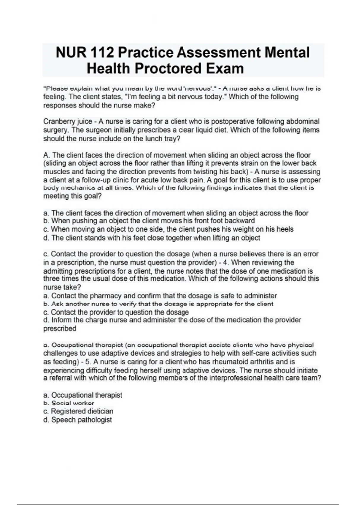 "Please explain what you mean by the word 'nervous'." - A nurse asks a client how he is feeling. The client states, "I'm feeling a bit nervous today." Which of the following responses should the nurse make? Cranberry juice - A nurse is caring for a client who is postoperative following abdominal surgery. The surgeon initially prescribes a clear liquid diet. Which of the following items should the nurse include on the lunch tray? A. The client faces the direction of movement when sliding an object across the floor (sliding an object across the floor rather than lifting it prevents strain on the lower back muscles and facing the direction prevents from twisting his back) - A nurse is assessing a client at a follow-up clinic for acute low back pain. A goal for this client is to use proper body mechanics at all times. Which of the following findings indicates that the client is meeting this goal? a. The client faces the direction of movement when sliding an object across the floor b. When pushing an object the client moves his front foot backward c. When moving an object to one side, the client pushes his weight on his heels d. The client stands with his feet close together when lifting an object c. Contact the provider to question the dosage (when a nurse believes there is an error in a prescription, the nurse must question the provider) - 4. When reviewing the admitting prescriptions for a client, the nurse notes that the dose of one medication is three times the usual dose of this medication. Which of the following actions should this nurse take? a. Contact the pharmacy and confirm that the dosage is safe to administer b. Ask another nurse to verify that the dosage is appropriate for the client c. Contact the provider to question the dosage d. Inform the charge nurse and administer the dose of the medication the provider prescribed a. Occupational therapist (an occupational therapist assists clients who have physical challenges to use adaptive devices and strategies to help with self-care activities such as feeding) - 5. A nurse is caring for a client who has rheumatoid arthritis and is experiencing difficulty feeding herself using adaptive devices. The nurse should initiate a referral with which of the following members of the interprofessional health care team? a. Occupational therapist b. Social worker c. Registered dietician d. Speech pathologist NUR 112 Practice Assessment Mental Health Proctored Exam c. Interpersonal (interpersonal communication is face-to-face interaction with another person. It results in an exchange of ideas, problem solving expression of feelings, decision making, and personal growth) - 6. A nurse receives a client care assignment from the charge nurse that he believes is unfair. The nurse voices his concern to the charge nurse. The nurse is using which level of communication at this time? a. Transpersonal b. Intrapersonal c. Interpersonal d. Public b. Determine the client's level of fluency in his primary language (it is important to determine the client's level of fluency in her primary language and the nurse's language to provide teaching the client can understand) - 7. A nurse is developing a plan of care for a client who does not speak the same language as the nurse. Which of the following interventions should the nurse include? a. Make sure a family member is present to interpret for the staff. b. Determine the client's level of fluency in his primary language c. Speak directly to the interpreter when teaching the client d. Encourage the client to nod to indicate understanding c. Surgeon (the health care provider who will perform the treatment or procedure is responsible for obtaining informed consent from the client) - 8. A nurse is caring for a client who has a hip fracture that requires surgical repair. Which of the following health care professionals is responsible for obtaining informed consent from the client for the procedure? a. Nurse b. Anesthesiologist c. Surgeon d. Surgical suite nurse a. Complete a neurological check (appropriate nursing intervention when a client displays sudden confusion) - 9. A nurse on a medical unit is caring for a client who suddenly becomes confused and drowsy. Additional data includes pulse 100/min, RR 24/min, BP 124/76 mm Hg, and temp 36.8C (98.2 F). which of the following actions should the nurse perform? a. Complete a neurological check b. Administer the prescribed PRN antihypertensive medication c. Increase the fluid intake d. Hold the client's evening dose of digoxin a. Documentation is a communication tool for the interprofessional health care team - 10. A nurse is orienting a newly licensed nurse about documentation of a client's information in the electronic health record. Which of the following statements by the newly licensed nurse indicates understanding of the purpose of documentation? a. Documentation is a communication tool for the interprofessional health care team b. Documentation provides information to the client about financial charges for care provided c. Documentation provides information for a client audit d. Documentation allows providers to monitor the nurse's activities c. Washes and rinses her hands for 10 seconds - 11. A nurse is orienting a new assistive personal (AP) to the unit. For which of the following actions should the nurse intervene? a. Wears a gown when entering the room of a client who requires contact precautions b. Dons gloves to empty a urinary drainage device c. Washes and rinses her hands for 10 seconds d. Wears a respirator mask when entering the room of a client who requires airborne precautions c. Industry vs inferiority (a school age child (6-12) is in this stage of development) - 12. A nurse is planning home care for a 9-year-old child following an acute exacerbation of asthma. Which of the following of Erikson's developmental stages should the nurse consider in the planning? a. Autonomy vs shame and doubt b. Initiative vs guilt c. Industry vs inferiority d. Identity vs r