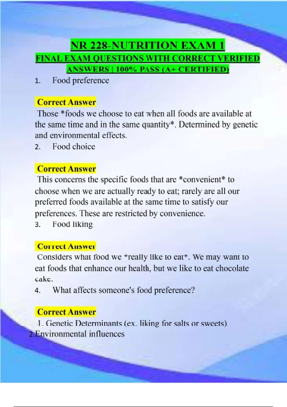 NR 228-NUTRITION EXAM 1 FINAL EXAM QUESTIONS WITH CORRECT VERIFIED ANSWERS | 100% PASS (A+ CERTIFIED) 1. Food preference Correct Answer 2. Those *foods we choose to eat when all foods are available at the same time and in the same quantity*. Determined by genetic and environmental effects. Food choice Correct Answer 3. This concerns the specific foods that are *convenient* to choose when we are actually ready to eat; rarely are all our preferred foods available at the same time to satisfy our preferences. These are restricted by convenience. Food liking Correct Answer 4. Considers what food we *really like to eat*. We may want to eat foods that enhance our health, but we like to eat chocolate cake. What affects someone's food preference? Correct Answer 1. Genetic Determinants (ex. liking for salts or sweets) 2. Environmental influences 3. Media influences 5. Hunger Correct Answer The inability to access enough food to feel nourished and satisfied. 6. Variety Correct Answer One of the four themes of MyPlate recommendations. This involves eating food from all food groups and subgroups. 7. Proportionality Correct Answer One of the four themes of MyPlate recommendations. It involves eating more of some foods (fruits, vegetables, whole grains, fat-free or low-fat milk products) and less of others (foods high in saturated or trans fats, added sugars, cholesterol salt, and alcohol). 8. Moderation Correct Answer One of the four themes of MyPlate recommendations. Choose types of foods that limit intake of saturated or trans fats, added sugars, cholesterol, salt, and alcohol. 9. Activity Correct Answer 10. One of the four themes of MyPlate recommendations. Be physically active every day. Syndrome X Correct Answer 11. Also known as "metabolic syndrome" is a group of heart disease risk factors including *abdominal obesity, glucose intolerance, high blood pressure, and abnormal blood lipid levels* Healing foods pyramid Correct Answer 12. The ___________ ________ __________ emphasizes foods with restorative benefits and/or essential nutrients in natural forms. The core of dietary intake is primarily plant-based foods, with small amounts of animal foods. the "healing" aspect of this also applies to the production of the food supply. Experimental study Correct Answer 13. Type of research. Consists of an *experimental group* receiving treatment (or dietary change) and a *control group* receiving no treatment (no dietary change); differences, if any, are then noted. called clinical or laboratory study. Case study Correct Answer 14. Type of research. analyzes an *individual case* of a disease or health difference to determine how factors may influence health; a naturalistic study because no manipulation of dietary intake or behavior occurs. Epidemiologic study Correct Answer 15. Type of research. *Studies populations*; tracks the occurrence of health or disease processes among populations; may use historical data, surveys, and/or medical records to determine possible factors influencing the health of a group of people. Irradiation Correct Answer A procedure by which *food is exposed to radiation* that destroys microorganisms, insect growth, and parasites that could spoil food or cause illness. This food preservation technology results in an increase of international and domestic food trade. These foods may have a *longer shelf life* 16. Glycogen Correct Answer 17. Carbohydrate energy stored in the liver and in the muscles. Glycogenolysis Correct Answer Process when glycogen stored in the liver and muscle tissue is converted back to glucose. 18. Gluconeogenesis Correct Answer 19. The process of producing glucose from fat. Ketone bodies Correct Answer 20. Created when fatty acids are broken down for energy when sufficient carbohydrates are unavailable. Insulin Correct Answer 21. A hormone produced by the beta cells of the islets of Langerhans, lowers blood glucose levels by enhancing the conversion of excess glucose to glycogen through glycogenesis or to fat stored in adipose tissue. It also eases the absorption of glucose into the cells so the use of glucose as energy is increased.