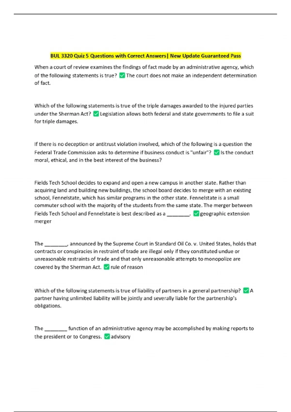 BUL 3320 Quiz 5 Questions with Correct Answers| New Update Guaranteed Pass