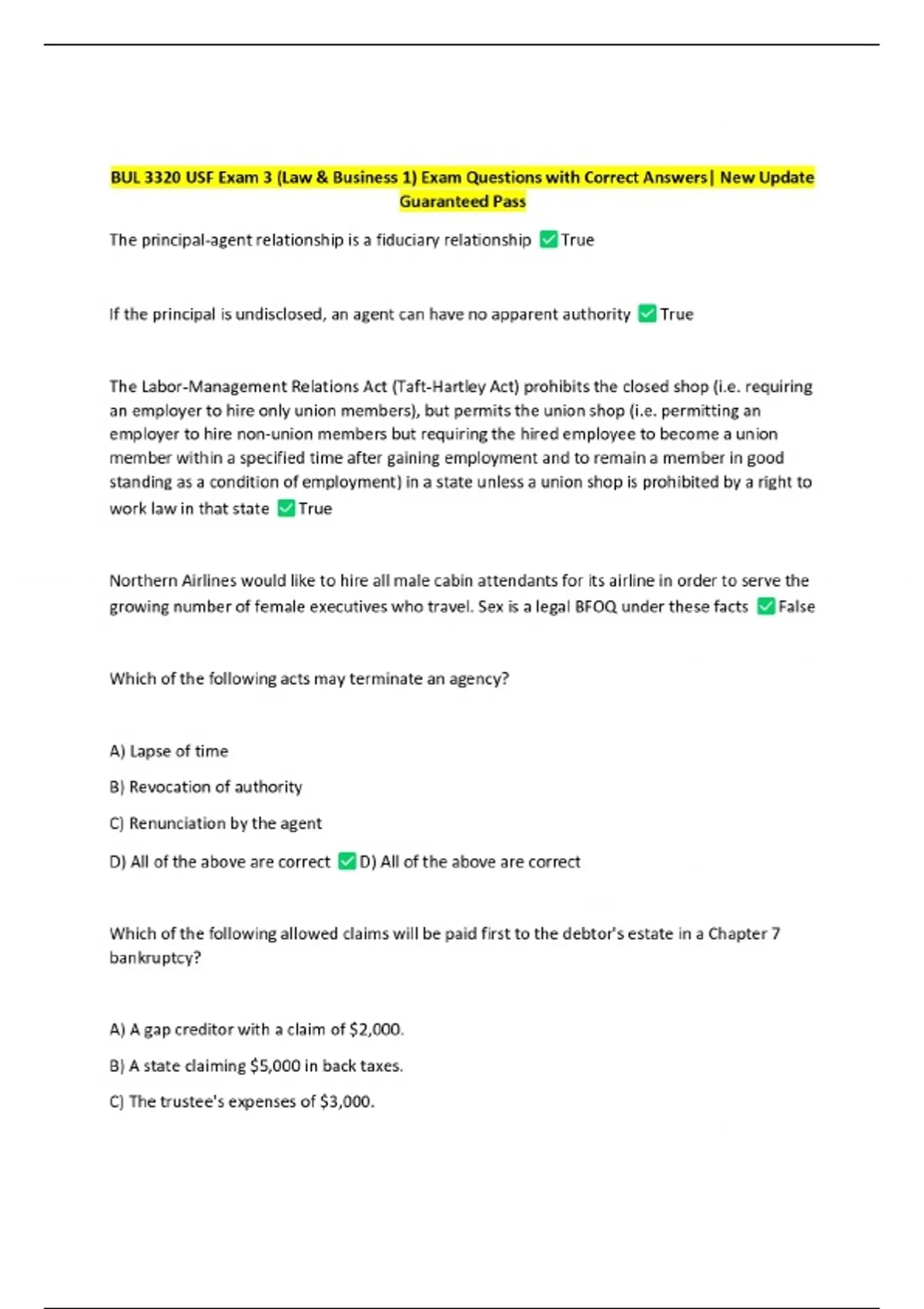 BUL 3320 USF Exam 3 (Law & Business 1) Exam Questions with Correct Answers| New Update Guaranteed Pass