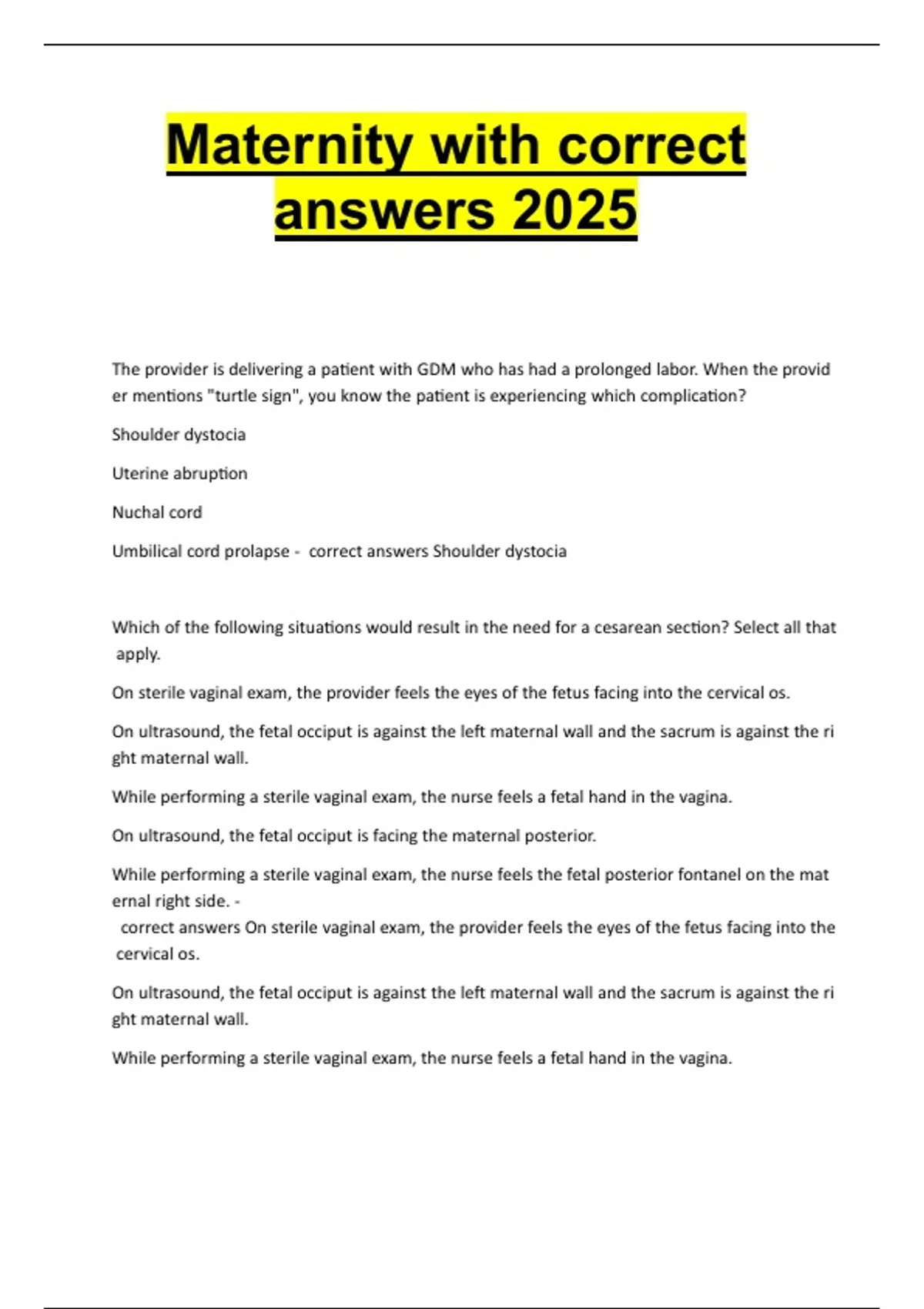 UmbilicalVcordVprolapseV-VVcorrectVanswersVShoulderVdystocia