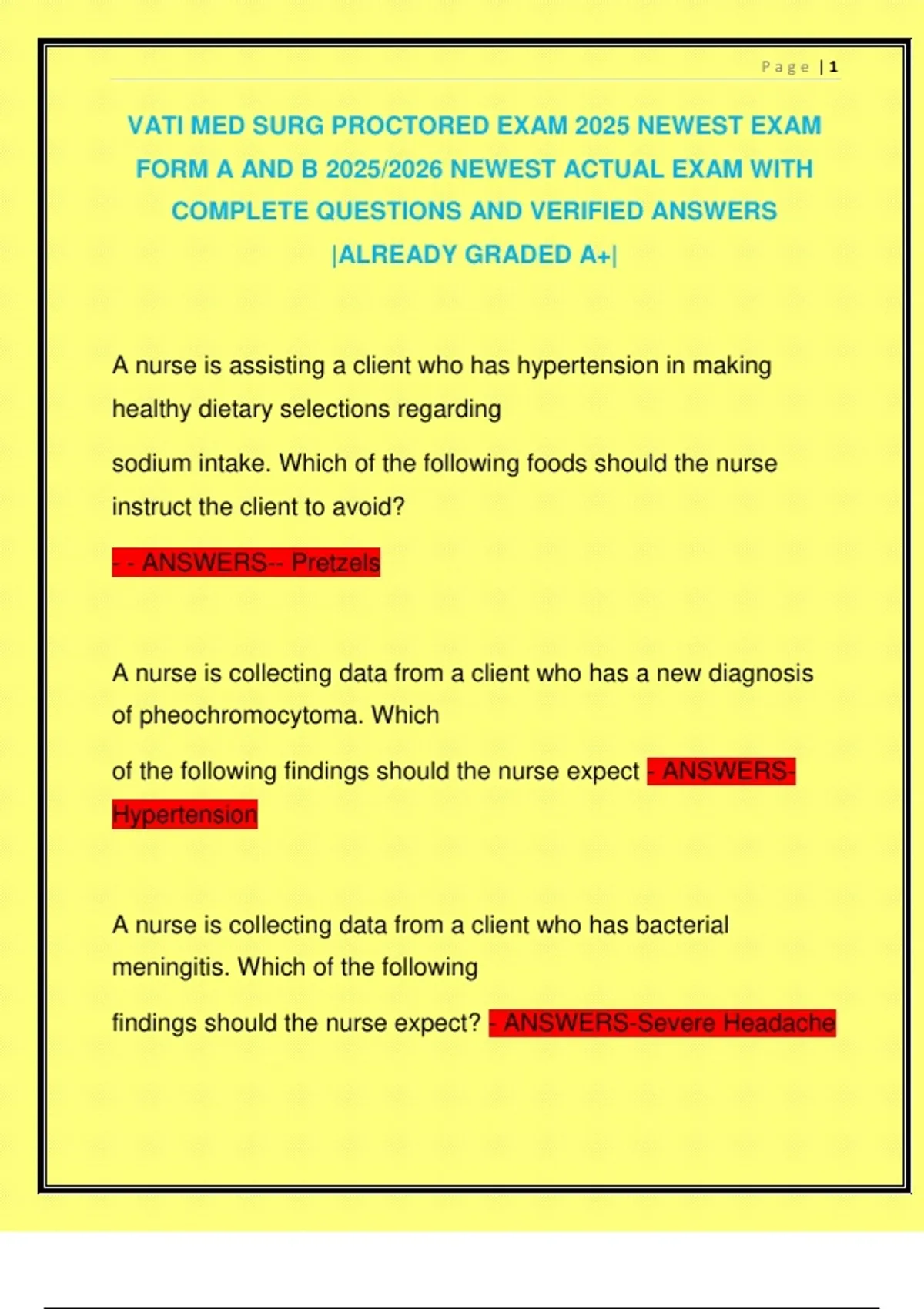 VATI MED SURG PROCTORED EXAM 2025 NEWEST EXAM FORM A AND B 2025/2026 NEWEST ACTUAL EXAM WITH COMPLETE QUESTIONS AND VERIFIED ANSWERS |ALREADY GRADED A+|