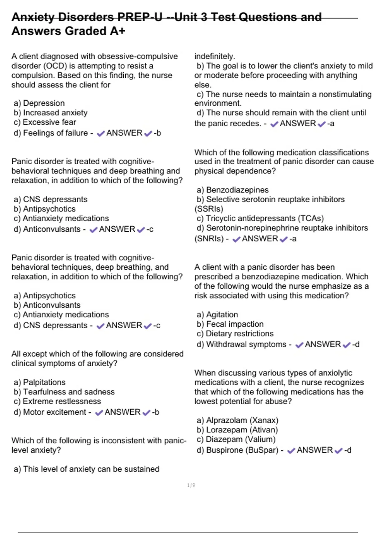 , Anxiety Disorders PREP-U --Unit 3 Test Questions and