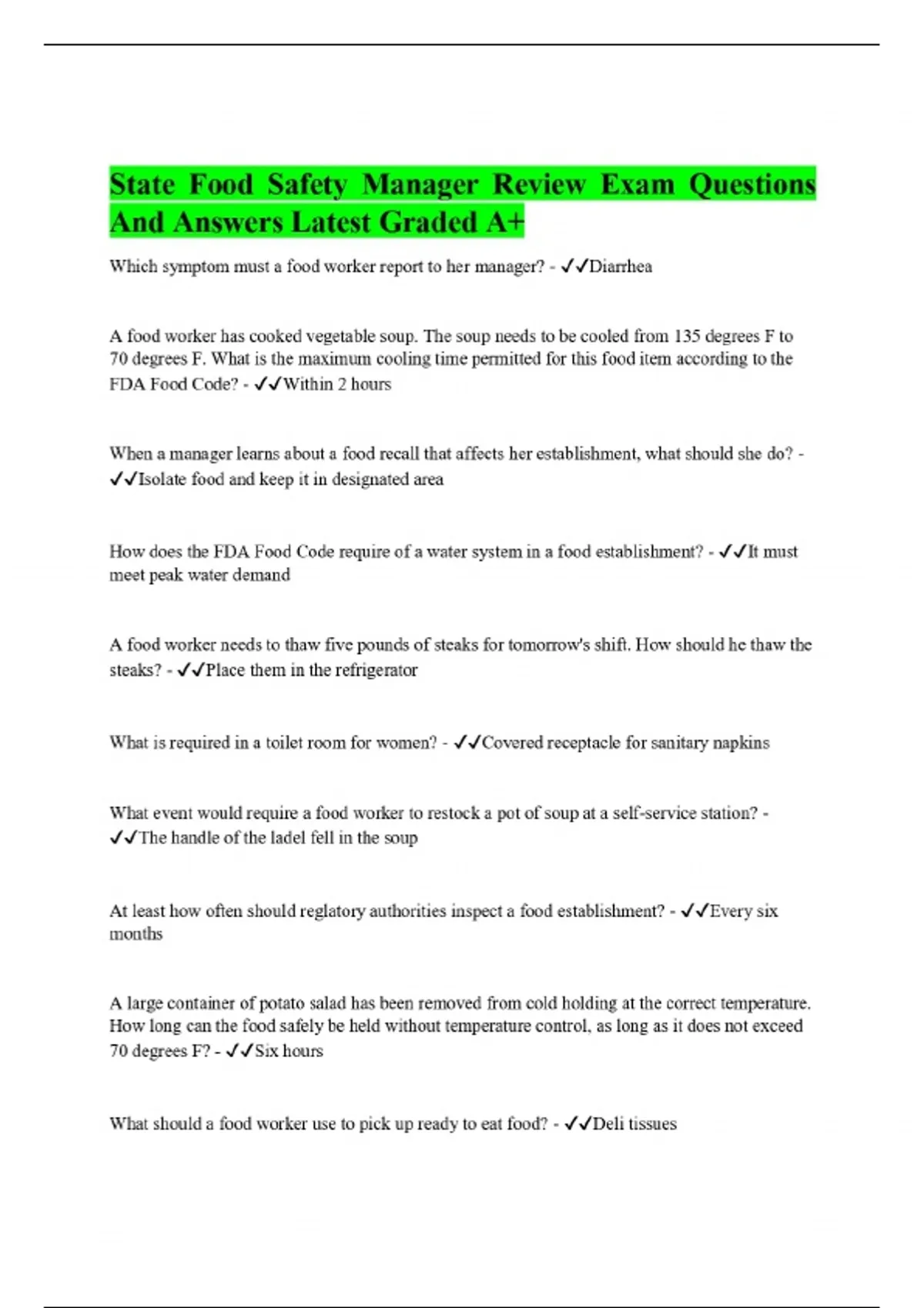 State Food Safety Manager Review Exam Questions And Answers Latest Graded A+