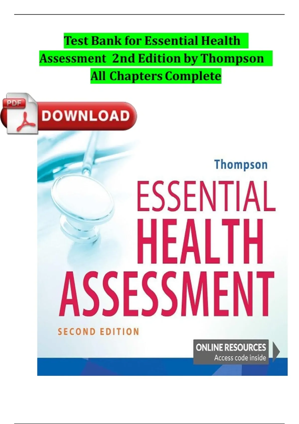 This document provides the complete test bank for Essential Health Assessment (2nd Edition) by Thompson, including all chapters with verified answers. It features multiple-choice, true/false, and scenario-based questions designed to test knowledge of patient assessment, clinical reasoning, and evidence-based nursing practice. Topics include physical examination techniques, health history collection, body system assessments, and interpretation of clinical findings. A comprehensive resource for nursing students and educators preparing for exams or clinical evaluations.