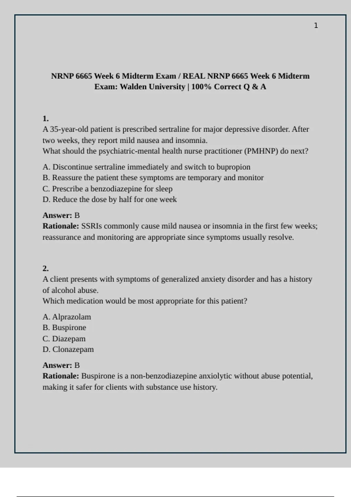 Ace your NRNP 6665 Week 6 Midterm Exam (Walden University) with this verified study pack containing 100% correct questions and detailed rationales. Designed for PMHNP students, this 2025-updated guide covers psychopathology, diagnosis, and treatment planning—exactly what appears on the midterm. Perfect for high-score preparation and clinical reasoning mastery.