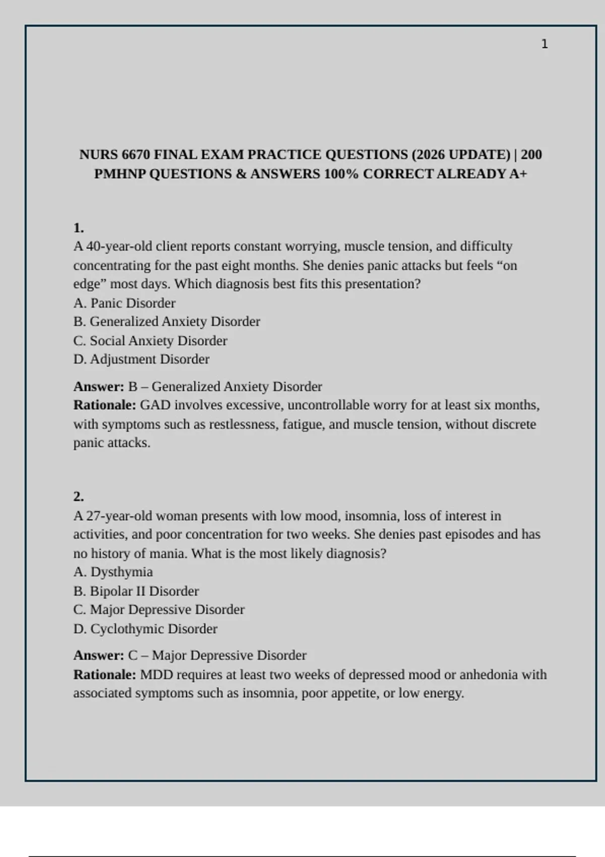 Prepare for success in your NURS 6670 Final Exam with this comprehensive 200-question PMHNP practice test. Each question includes detailed answers and rationales covering psychiatric assessment, psychopharmacology, therapy modalities, and advanced clinical decision-making. Designed for nursing students and mental health practitioners, this study guide mirrors real exam scenarios to strengthen critical thinking and diagnostic skills. Perfect for review, test simulation, or self-paced learning, it helps boost confidence and mastery of key psychiatric nursing concepts. Ideal for PMHNP board preparation and NURS 6670 course review at Walden University or similar graduate nursing programs