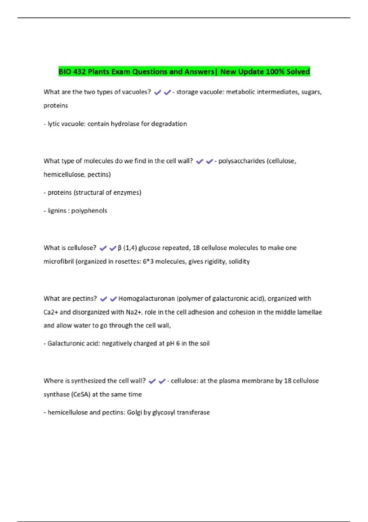 BIO 432 Plants Exam Questions and Answers| New Update 100% Solved