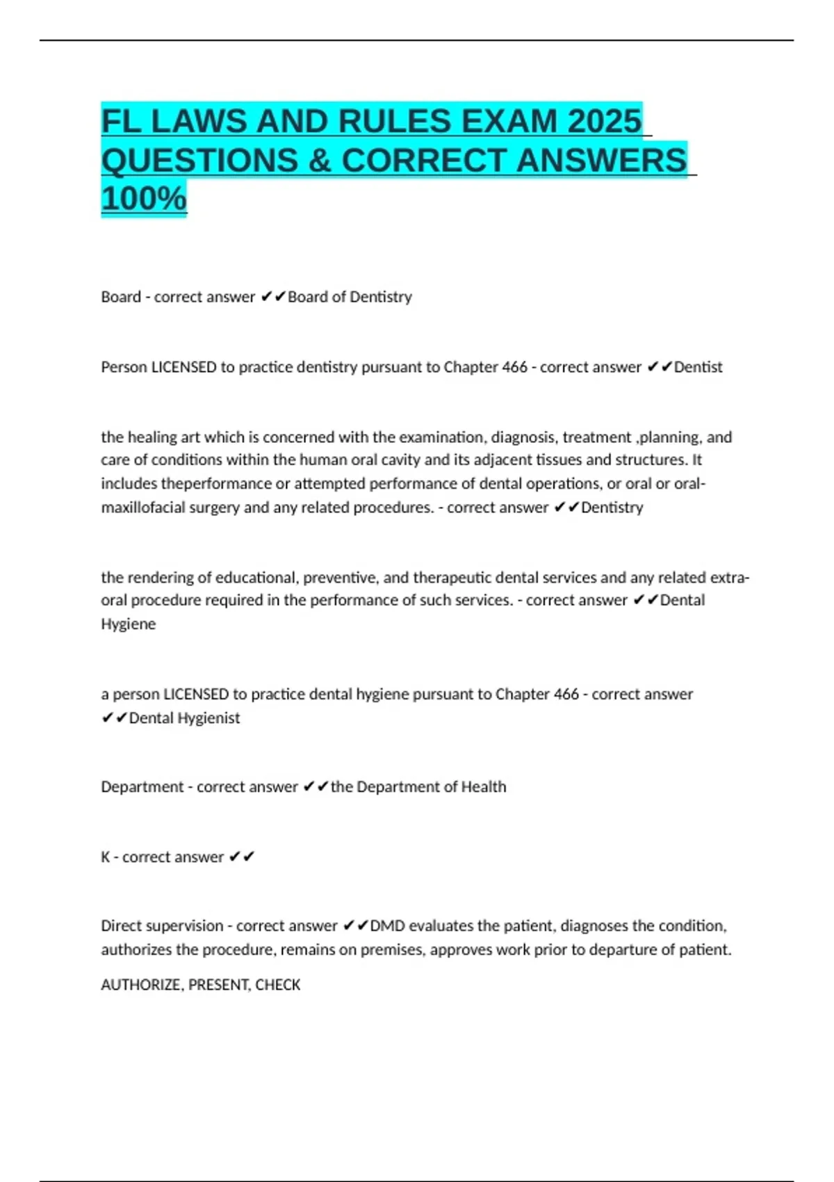 FL LAWS AND RULES EXAM 2025 QUESTIONS & CORRECT ANSWERS 100% simplifies complex dental legislation into easy-to-review topics—helping candidates master the legal and ethical foundations required for licensure in the state.