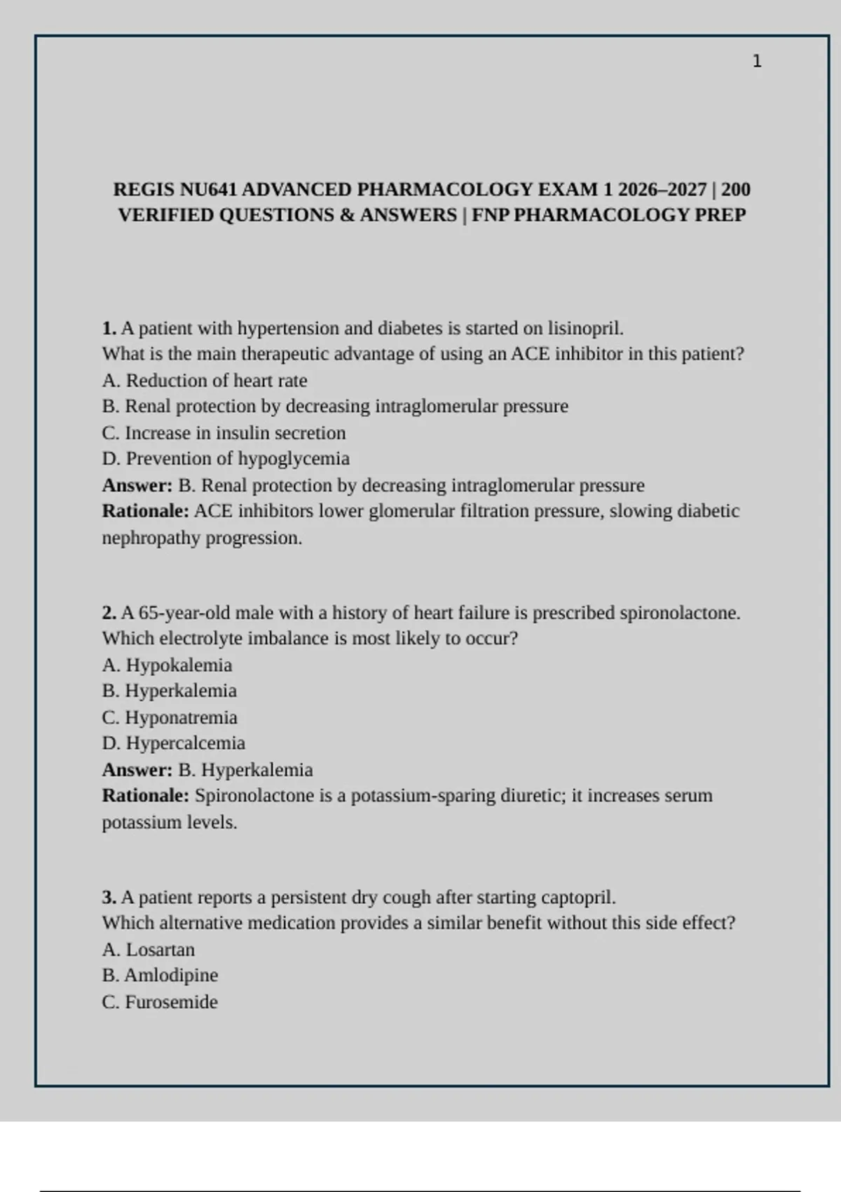 REGIS NU641 ADVANCED PHARMACOLOGY EXAM 1 2026–2027 | 200 VERIFIED QUESTIONS & ANSWERS | FNP PHARMACOLOGY PREP