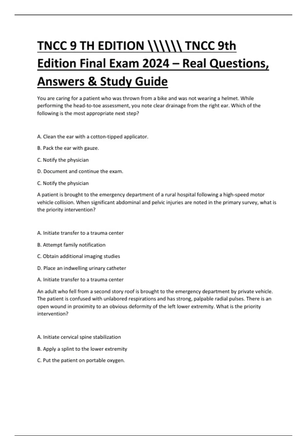 TNCC 9th Edition Final Exam 2024 – Real Questions, Answers & Study Guide