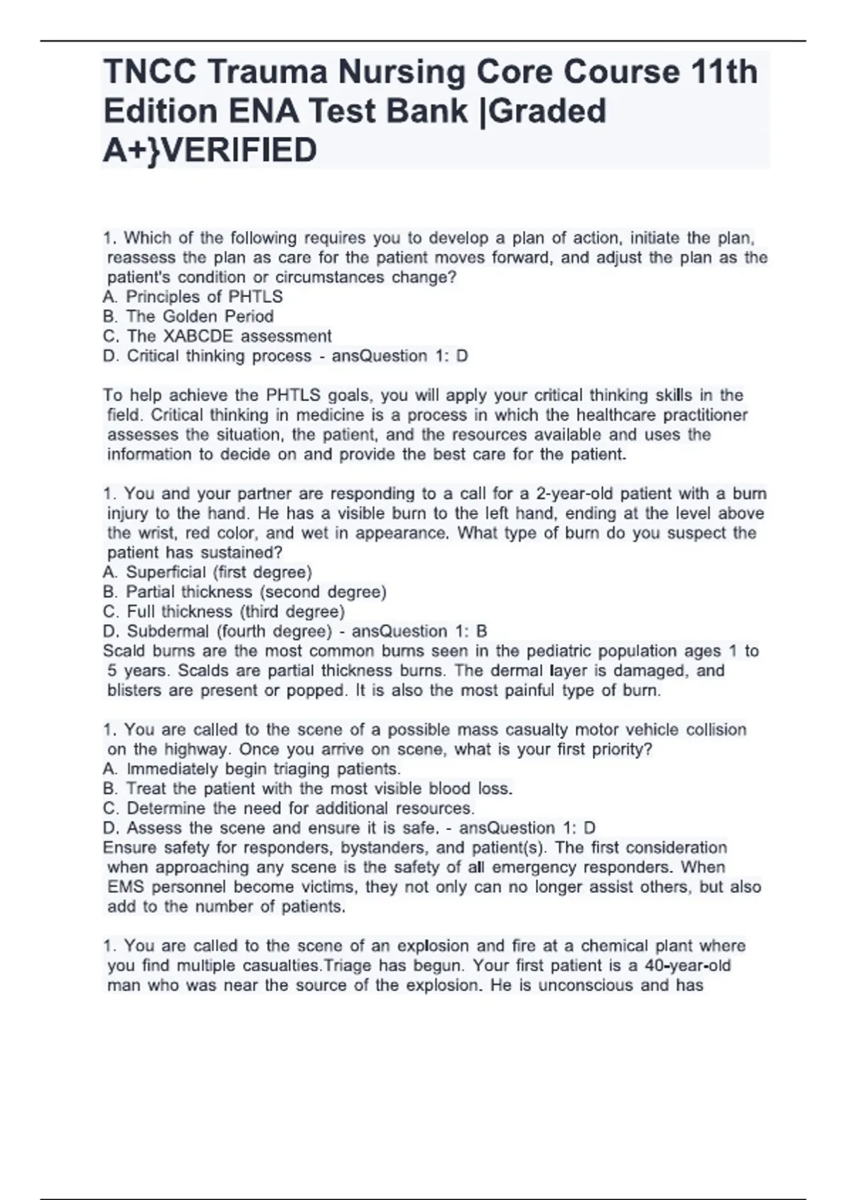 This document contains the complete Trauma Nursing Core Course (TNCC) test bank from the Emergency Nurses Association (ENA), updated for the 2024 edition. It includes multiple-choice and scenario-based questions with verified answers, covering all key TNCC modules such as initial assessment, airway and ventilation, shock management, head and spinal trauma, and pediatric trauma care. Ideal for nurses preparing for TNCC certification exams or review.