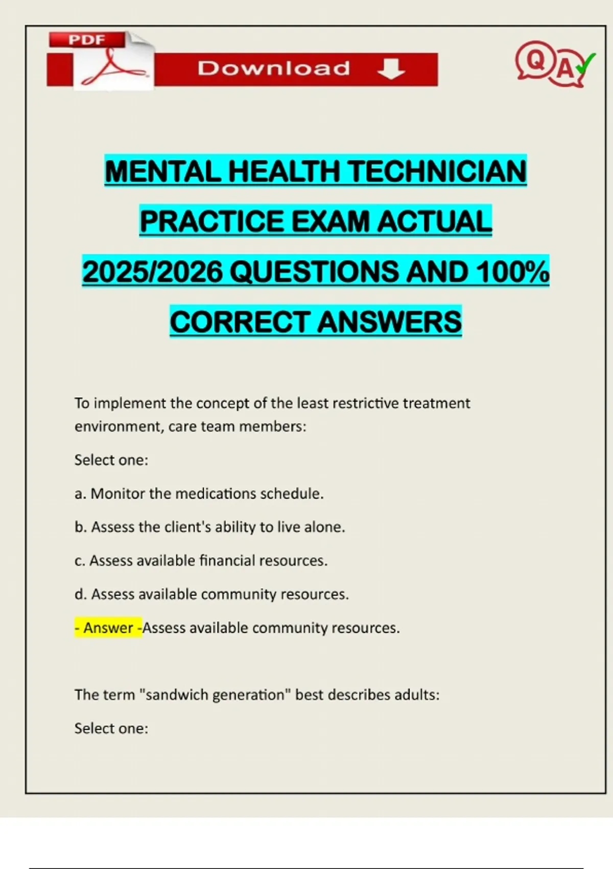MENTAL HEALTH TECHNICIAN PRACTICE EXAM ACTUAL 2025/2026 QUESTIONS AND 100% CORRECT ANSWERS To implement the concept of the least restrictive treatment environment, care team members: Select one: a. Monitor the medications schedule. b. Assess the client's ability to live alone. c. Assess available financial resources. d. Assess available community resources. - Answer -Assess available community resources. The term "sandwich generation" best describes adults: Select one:Need assistance on Online classes, Exams & Assignments? Reach out for instant help!! Full Course Assistance, Plagiarism-free Essay Writing, Research Paper, Dissertation, Discussion Posts, etc…. Confidential & Secure services. Tutors are available for all subjects! Email now at: a. Caught between adulthood and late adulthood b. Caring for their children and aging parents c. Caring for their children and grandchildren d. Caught between young adulthood and adulthood - Answer -Caring for their children and aging parents A male client is in the process of being admitted to a mental health facility. He is sure that the nurse is the administrator of the hospital, despite the nurse's insistence that he is a staff nurse on the unit. This client is experiencing: