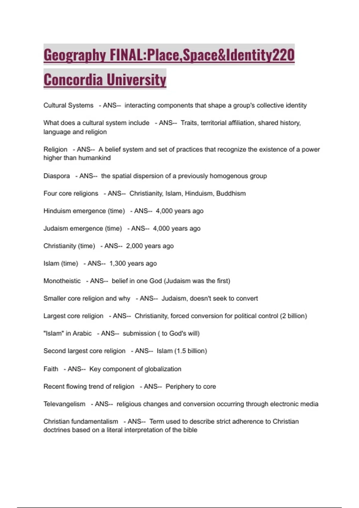 Cultural Systems - ANS-- interacting components that shape a group's collective identity What does a cultural system include - ANS-- Traits, territorial affiliation, shared history, language and religion Religion - ANS-- A belief system and set of practices that recognize the existence of a power higher than humankind Diaspora - ANS-- the spatial dispersion of a previously homogenous group Four core religions - ANS-- Christianity, Islam, Hinduism, Buddhism Hinduism emergence (time) - ANS-- 4,000 years ago Judaism emergence (time) - ANS-- 4,000 years ago Christianity (time) - ANS-- 2,000 years ago Islam (time) - ANS-- 1,300 years ago Monotheistic - ANS-- belief in one God (Judaism was the first) Smaller core religion and why - ANS-- Judaism, doesn't seek to convert Largest core religion - ANS-- Christianity, forced conversion for political control (2 billion) "Islam" in Arabic - ANS-- submission ( to God's will) Second largest core religion - ANS-- Islam (1.5 billion) Faith - ANS-- Key component of globalization Recent flowing trend of religion - ANS-- Periphery to core Televangelism - ANS-- religious changes and conversion occurring through electronic media Christian fundamentalism - ANS-- Term used to describe strict adherence to Christian doctrines based on a literal interpretation of the bible Sacred Spaces - ANS-- areas if the globe recognized by individuals or groups as worthy of special attention because they are the sites of special religious experiences and events the Creation - ANS-- Australian Aborigine interpretation of Earth during the Dreamtime Feng Shui - ANS-- Chinese practice, seeking earth for yin and yang energies, two energies kept in harmony Pilgrimage - ANS-- journey to a sacred space Pilgrim - ANS-- a person who undertakes the journey Hajj - ANS-- Once in a lifetime journey of Muslims to Mecca; praying in the city to receive grace of Allah Jerusalem - ANS-- Holy City, capital of Israel, Jewish, Christian and Islamic history Language - ANS-- Way of communicating by system of signs, gestures, marks or articulate vocal sounds Dialects - ANS-- Regional variations of language; featuring differences in pronunciation, grammar and vocabulary that are place based in nature Language family - ANS-- a collection of individual languages prehistorically connected; ex) Grey nuns, prehistorically connected by ancestors Indo-European family percentage - ANS-- 50% of world's people speak language that is in Indo-European family Language Branch - ANS-- collection of languages that possesses a definite common origin but has split into individual languages; ex) Common interests on hallways (same floor of grey nuns), but split (by rooms) Language group - ANS-- collection of several individual languages that is part of a language branch, shares a common origin in the recent past, and has relatively similar grammar and vocab; ex friend group at grey nuns collected in hallways Carl Sauer - ANS-- Identified the origins of certain cultural practices with the label "cultural hearth" Isolate - ANS-- Language that has no other connections to any other languages, known through numerals Allophone - ANS-- If the mother tongue isn't french or english number of languages spoken in the world - ANS-- 4,000-5,000 Cultural hearths - ANS-- the geographic origins or sources of innovations, ideas, or ideologies the State - ANS-- An independent political unit with recognized boundaries; ex) walls of grey nuns Nation - ANS-- group of people sharing certain elements of culture such as religion, language, history or political identity; ex) residence of grey nuns Nation-state - ANS-- Refers to an ideal form consisting of a homogeneous group of people governed by their own state; ex) all go to Concordia Sovereignty - ANS-- the exercise of state power over people and territory; that power is recognized by other states and codified by international law; ex) enforcing lease signed at grey nuns Citizenship - ANS-- belonging to a nation-state that included civil, political, and social rights as well as obligations Multinational states - ANS-- States composed of more than one regional or ethnic group Nationalism - ANS-- The feeling of belonging to a nation and the belief that a nation has a natural right to determine its own affairs; ex) school spirit Federal State - ANS-- Allocates some power to units of local government within the country; ex) head RA's Unitary state - ANS-- Power is concentrated in the central government; ex) North Korea USSR - ANS-- tension among states, nations, and nationalism illustrated by the current state. Desire for sovereignty, strategy to bind 100 nationalities into Russian state, and it wasn't successful. Non-Russian nations were forced to confide in Russian cultures or else; this caused rebellion. Vladimir suggested "recognition" which ensured independence; enforced federal units to provide equality. 1985: still under federal system New leader wanted democratic reform, lifted restrictions, Russia entered CIS CIS - ANS-- Commonwealth Independent States (a confederation) Confederation - ANS-- A group of sovereign states unite for a common purpose Canada Confederation - ANS-- Refers to process of forming the Canadian dominion in 1867, Canada is federal Discourse - ANS-- Institutionalized way of thinking Economic rent - ANS-- amount of economic returns (profit) when you subtract costs from income Economic advantage - ANS-- high-volume retailing is more profitable than installing factories Bid-rent - ANS-- around of $ that a corporation/business/individual will pay to have access to a manufacturing space Self-determination - ANS-- The right of a group with distinctive political territorial identity to determine its own destiny through control of its own territory Regional movements - ANS-- movement to claim or reclaim particular territories Regionalism - ANS-- The feeling of collective identity based on a population's political territorial identification within a state or across state boundar