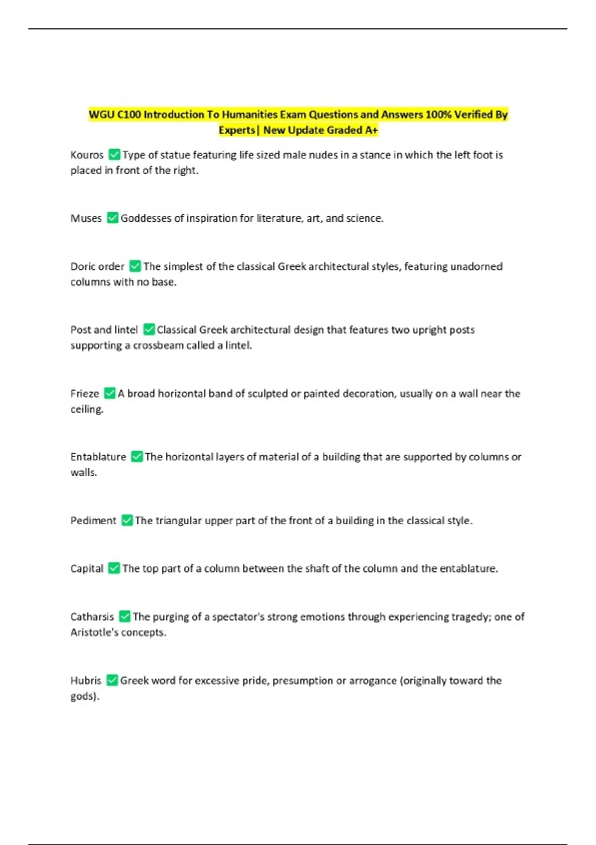 WGU C100 Introduction To Humanities Exam Questions and Answers 100% Verified By Experts| New Update Graded A+