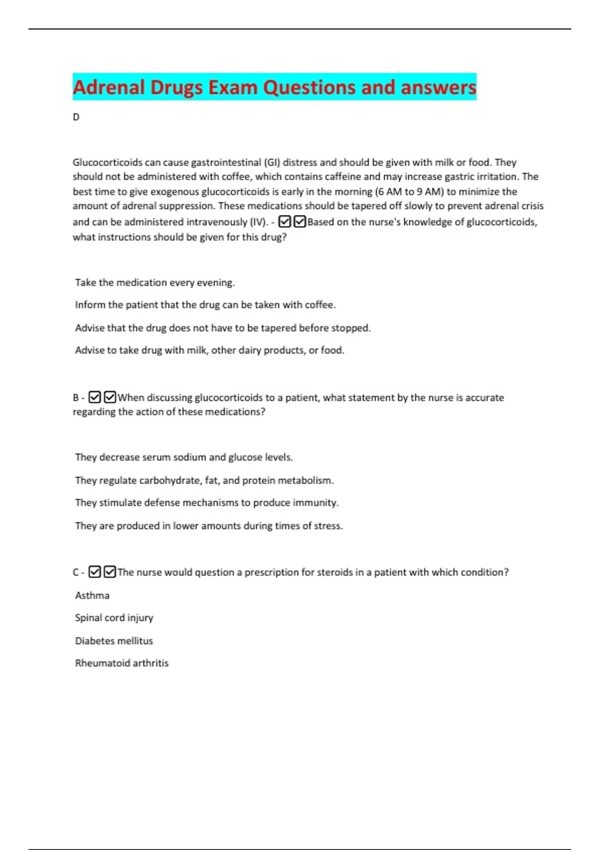 Adrenal Drugs Exam Questions and answers