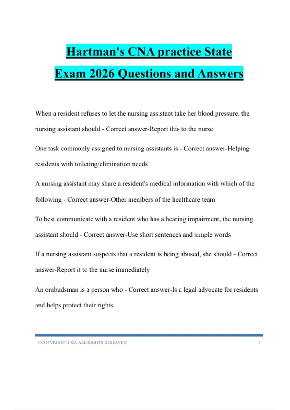 Hartman's CNA practice State Exam 2026 Questions and Answers
