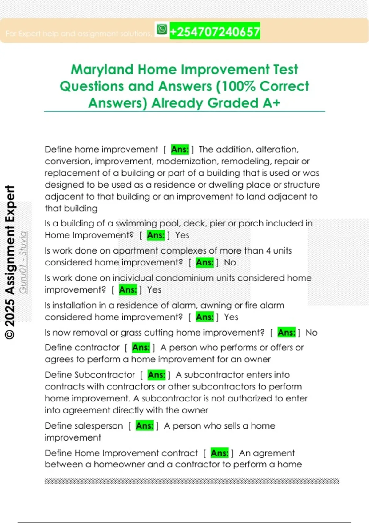 Maryland Home Improvement Test Questions and Answers (100% Correct Answers) Already Graded A+