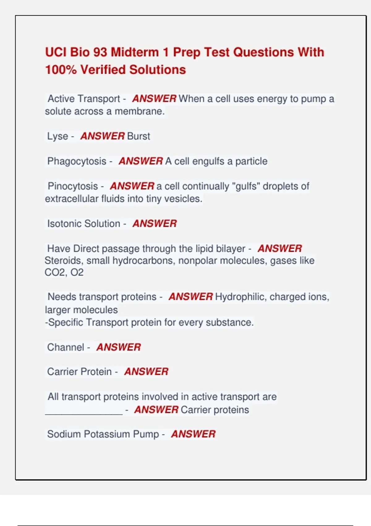 UCI Bio 93 Midterm 1 Prep Test Questions With 100% Verified Solutions Active Transport - ANSWER When a cell uses energy to pump a solute across a membrane. Lyse - ANSWER Burst Phagocytosis - ANSWER A cell engulfs a particle Pinocytosis - ANSWER a cell continually "gulfs" droplets of extracellular fluids into tiny vesicles. Isotonic Solution - ANSWER Have Direct passage through the lipid bilayer - ANSWER Steroids, small hydrocarbons, nonpolar molecules, gases like CO2, O2 Needs transport proteins - ANSWER Hydrophilic, charged ions, larger molecules -Specific Transport protein for every substance. Channel - ANSWER Carrier Protein - ANSWER All transport proteins involved in active transport are ______________ - ANSWER Carrier proteins Sodium Potassium Pump - ANSWER Takes in 3 Na, Then an ATP gives a phosphate, then Na is released and 2 K are taken into cell. - ANSWER Sodium Potassium Pump What is ATP after giving up a phosphate - ANSWER ADP Co-Transporter - ANSWER Endocytosis - ANSWER Vesicle is former from plasma membrane, bringing external molecules inside cell Exocytosis - ANSWER Internal membrane vesicle fuses with plasma membrane, releasing molecules to outside 3 types of endocytosis - ANSWER Phagocytosis, Pinocytosis, and Receptor-Mediated Endocytosis LDL - ANSWER Low Density Lipoproteins HDL - ANSWER High Density Lipoproteins LDL Connects to ______, then _____ connects to the receptors, then ______ connects to the adaptin. - ANSWER LDL Receptors, Adaptin, Clathrin What Organelle creates ATP - ANSWER Mitochondria The sites of photosynthesis in plant cells - ANSWER Chloroplasts Process that converts sunlight into sugars for the plant - ANSWER Photosynthesis Cristae - ANSWER Inner membrane of mitochondria Flattened interconnected sacs in Chloroplasts - ANSWER Thylakoids A Stack of thylakoids - ANSWER Granum Fluid outside thylakoids that contains Chloroplast DNA/Ribosomes - ANSWER Stroma A specilized metabolic compartment bounded by a single membrane. - ANSWER Peroxisome A network of fibers extending throughout the cytoplasm - ANSWER Cytoskeleton Obvious function of the cytoskeleton - ANSWER Support and maintain the shape of the cell Cell motility - ANSWER changes in cell location and movement Interacts with the cytoskeleton to help it move - ANSWER Motor Proteins Fibers that make up cytoskeleton - ANSWER Microtubules, Microfilaments, Intermediate Filaments Which cytoskeleton fiber is the thickest? - ANSWER Microtubules What cytoskeleton fiber is the thinnest? - ANSWER