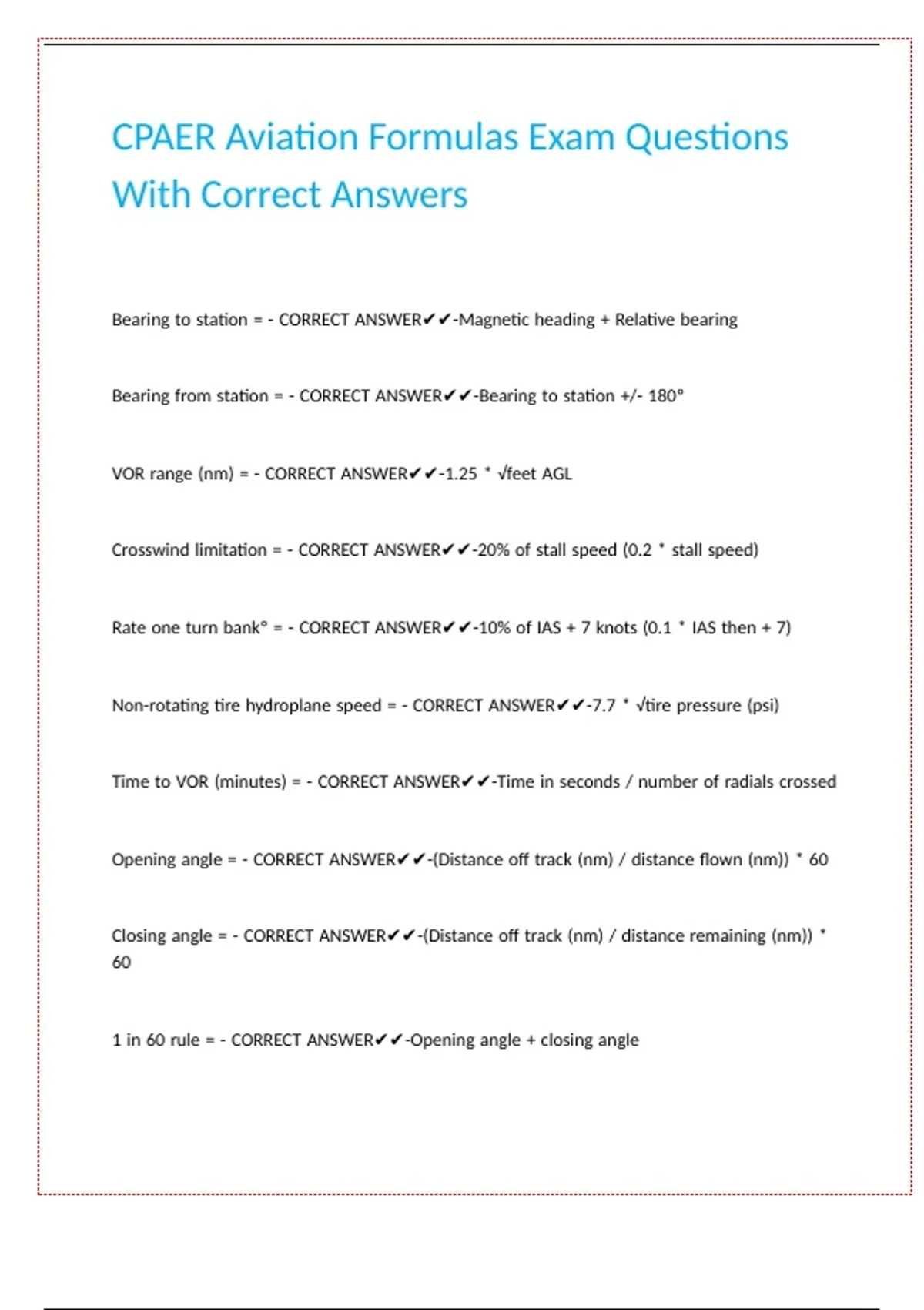 CPAER Aviation Formulas Exam Questions With Correct Answers