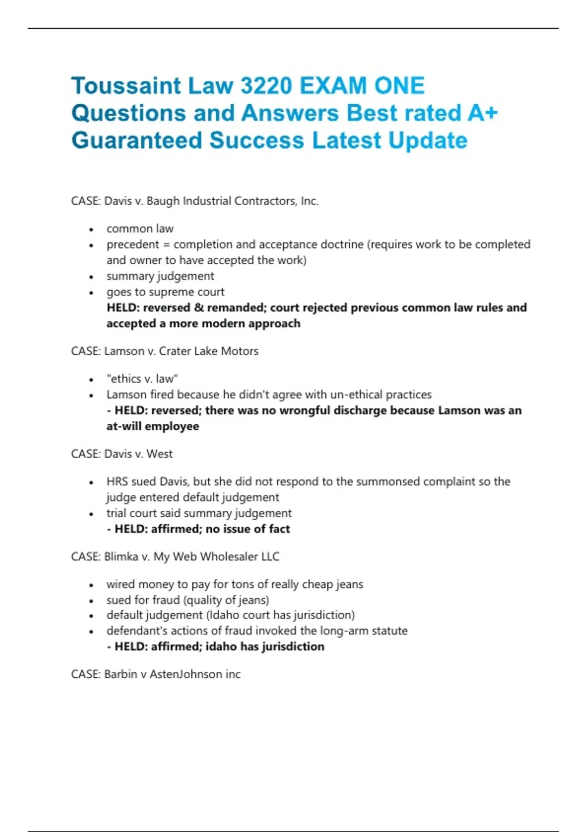 Toussaint Law 3220 EXAM ONE Questions and Answers Best rated A+ Guaranteed Success Latest Update