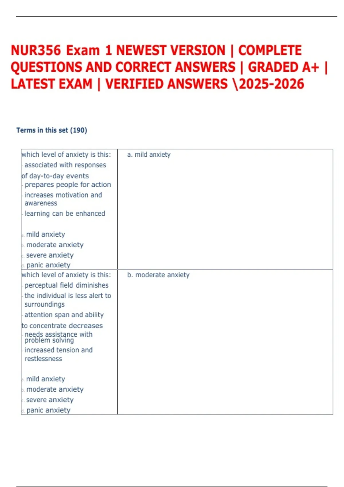 which level of anxiety is this: a. mild anxiety