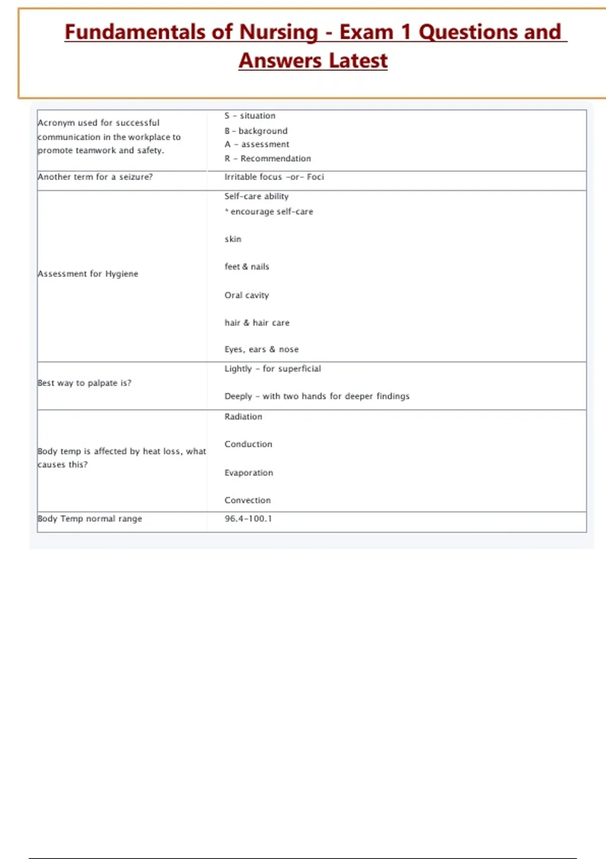 Fundamentals of Nursing - Exam 1 Questions and Answers Latest.