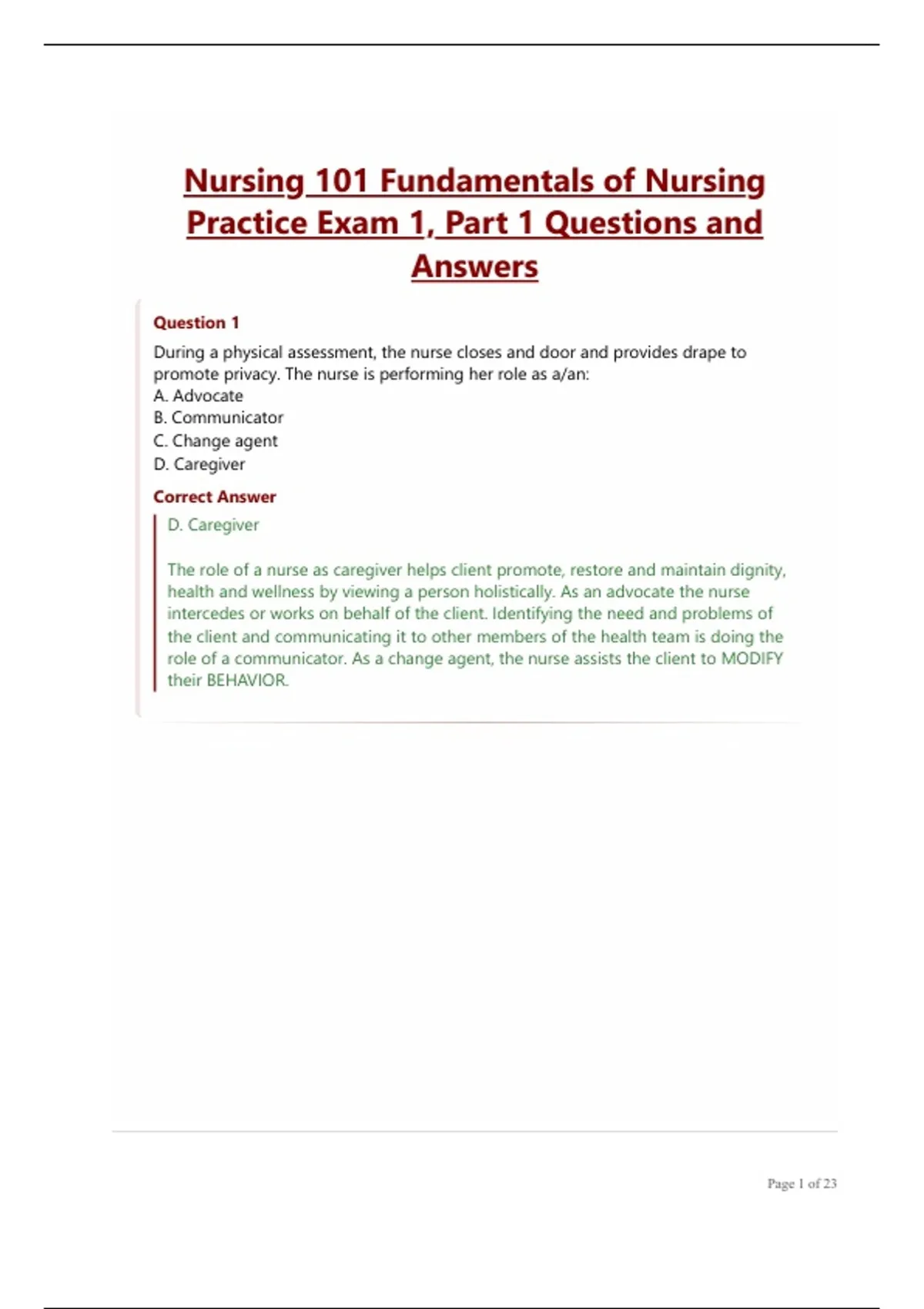 Nursing 101 Fundamentals of Nursing Practice Exam 1, Part 1 Questions and Answers