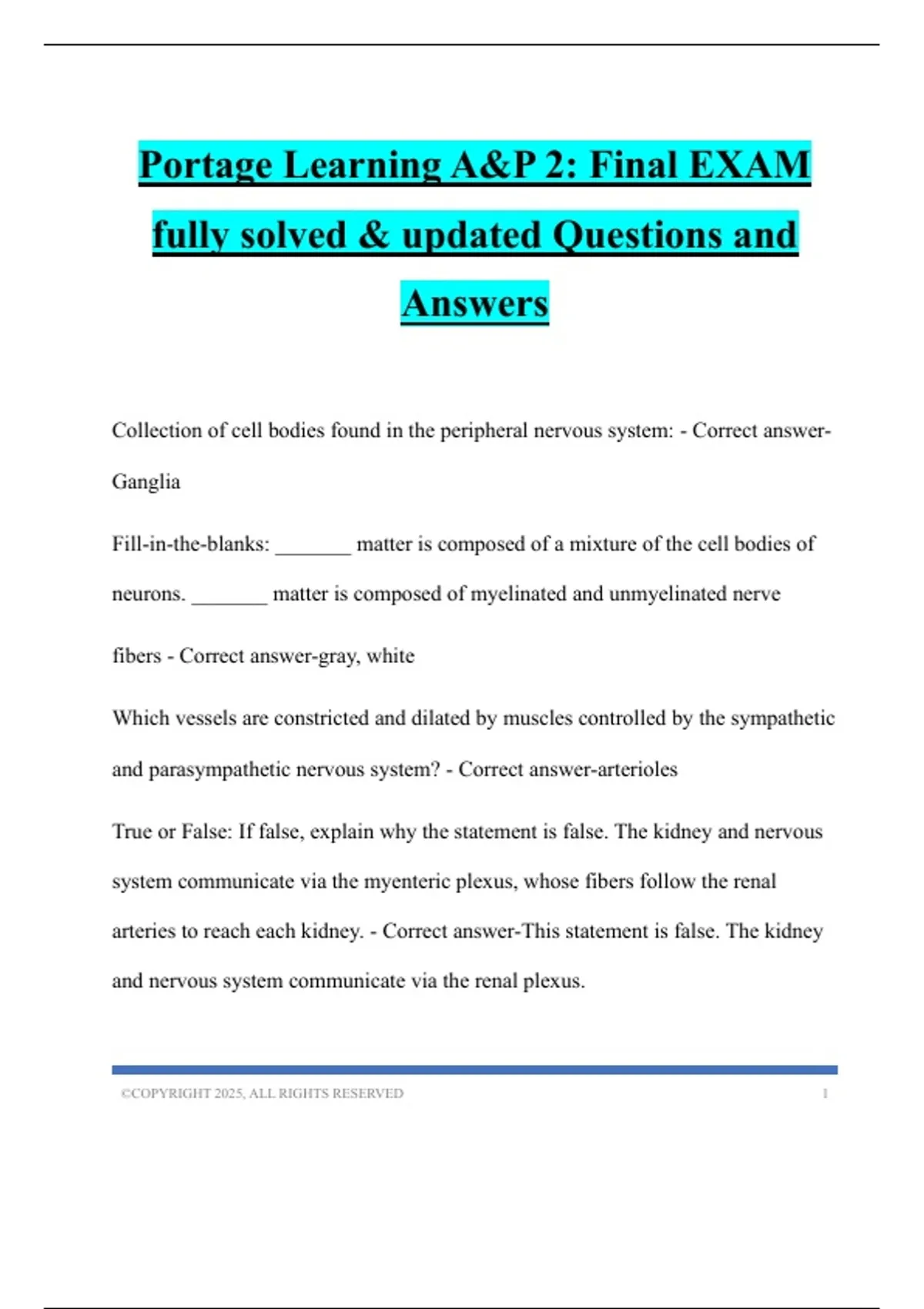 Portage Learning A&P 2: Final EXAM fully solved & updated Questions and Answers