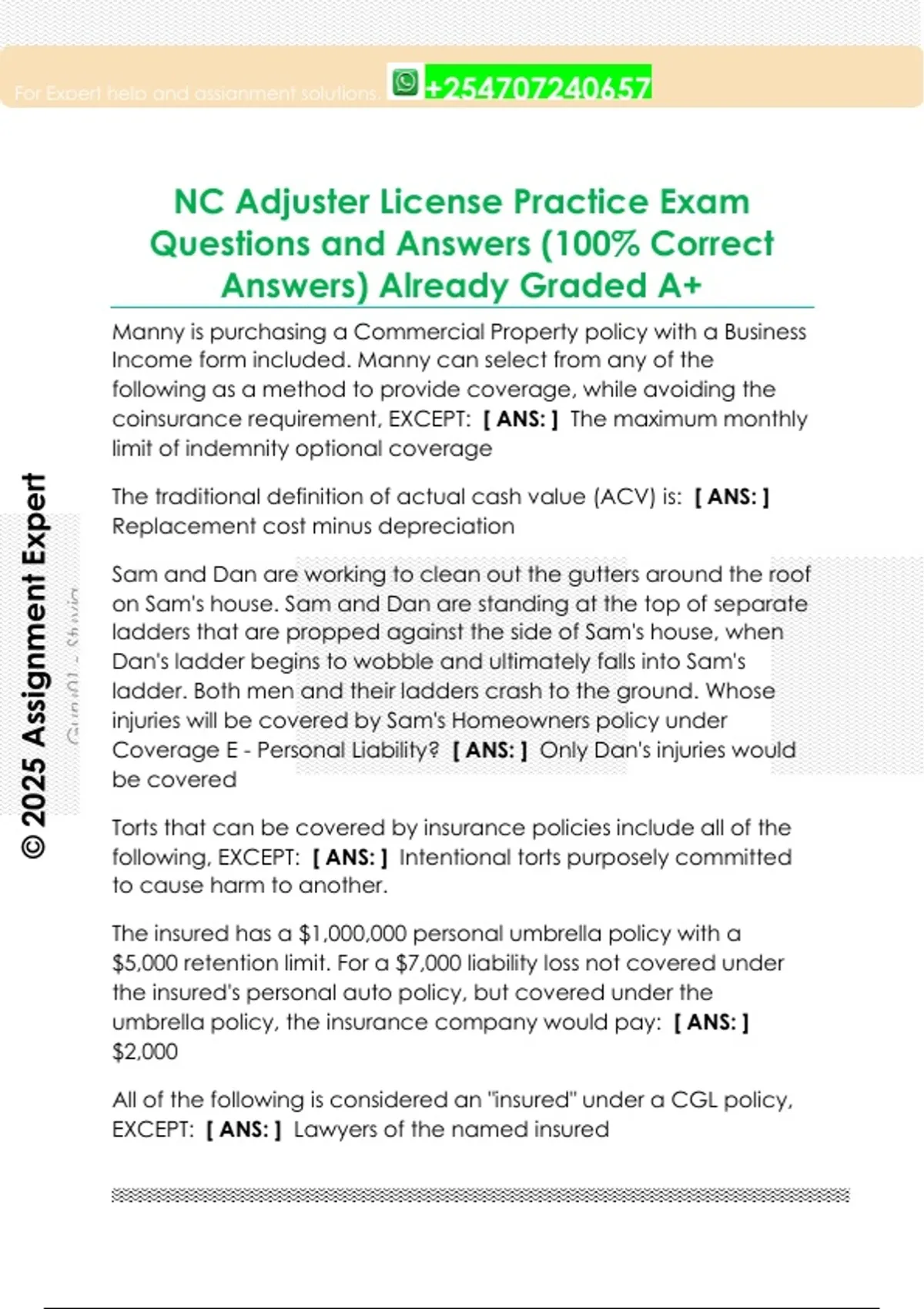 NC Adjuster License Practice Exam Questions and Answers (100% Correct Answers) Already Graded A+