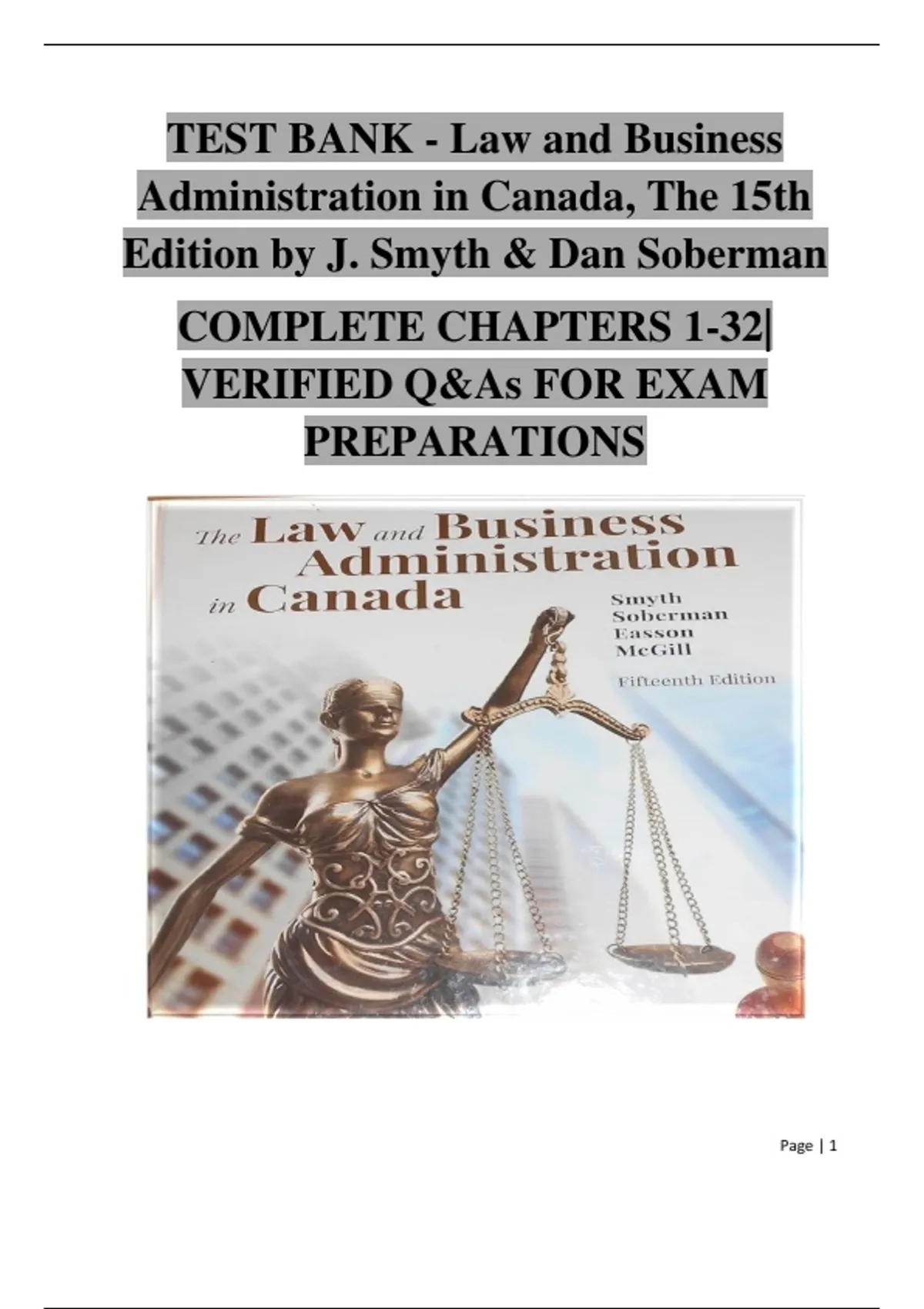 This comprehensive test bank covers all 32 chapters of Law and Business Administration in Canada (15th Edition) by J. Smyth and Dan Soberman. It includes multiple-choice, true/false, and essay questions with verified answers for every chapter, making it ideal for exam preparation and self-assessment. Topics span Canadian legal principles, business law, contracts, torts, corporate governance, and the Charter of Rights and Freedoms. Fully aligned with the textbook’s structure and suitable for both students and instructors.