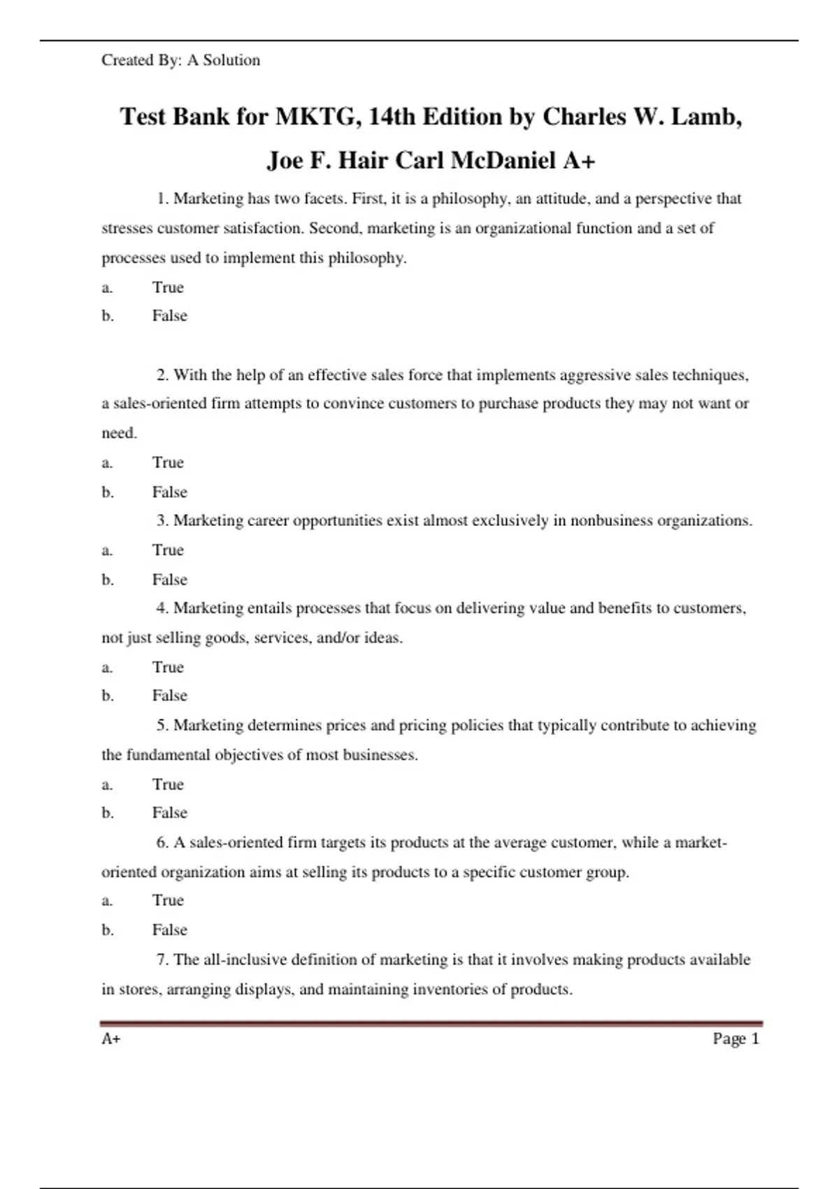 This document is the full test bank for MKTG, 14th Edition by Charles W. Lamb, Joe Hair, and Carl McDaniel. It contains hundreds of multiple choice, true/false, and essay questions organized by chapter, complete with answer keys. The content covers foundational marketing concepts such as customer value, segmentation, marketing strategy, product and brand management, consumer behavior, digital marketing, global marketing, and ethics. This resource is ideal for instructors preparing assessments and for students reviewing for quizzes, midterms, or final exams in introductory marketing courses. Part I: THE WORLD OF MARKETING. 1. An Overview of Marketing. 2. Strategic Planning for Competitive Advantage. 3. Ethics and Social Responsibility. 4. The Marketing Environment. 5. Developing a Global Vision. Part II: ANALYZING MARKETING OPPORTUNITIES. 6. Consumer Decision-Making. 7. Business Marketing. 8. Segmenting and Targeting Markets. 9. Marketing Research. Part III: PRODUCT DECISIONS. 10. Product Concepts. 11. Developing and Managing Products. 12. Services and Nonprofit Organization Marketing. Part IV: DISTRIBUTION DECISIONS. 13. Supply Chain Management and Marketing Channels. 14. Retailing. Part V: PROMOTION AND COMMUNICATION STRATEGIES. 15. Marketing Communications. 16. Advertising, Public Relations, and Sales Promotion. 17. Personal Selling and Sales Management. 18. Social Media and Marketing. Part VI: PRICING DECISIONS. 19. Pricing Concepts.