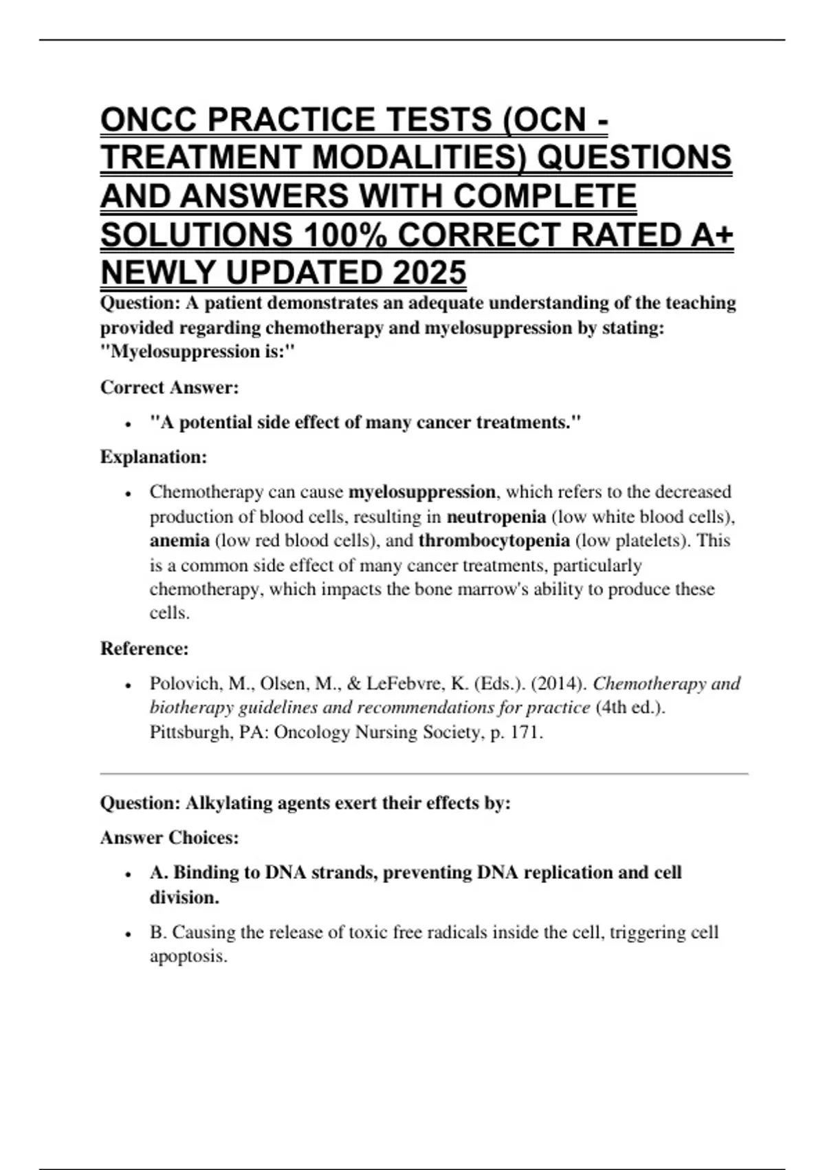 ONCC PRACTICE TESTS (OCN - TREATMENT MODALITIES) QUESTIONS AND ANSWERS WITH COMPLETE SOLUTIONS 100% CORRECT RATED A+ NEWLY UPDATED 2025