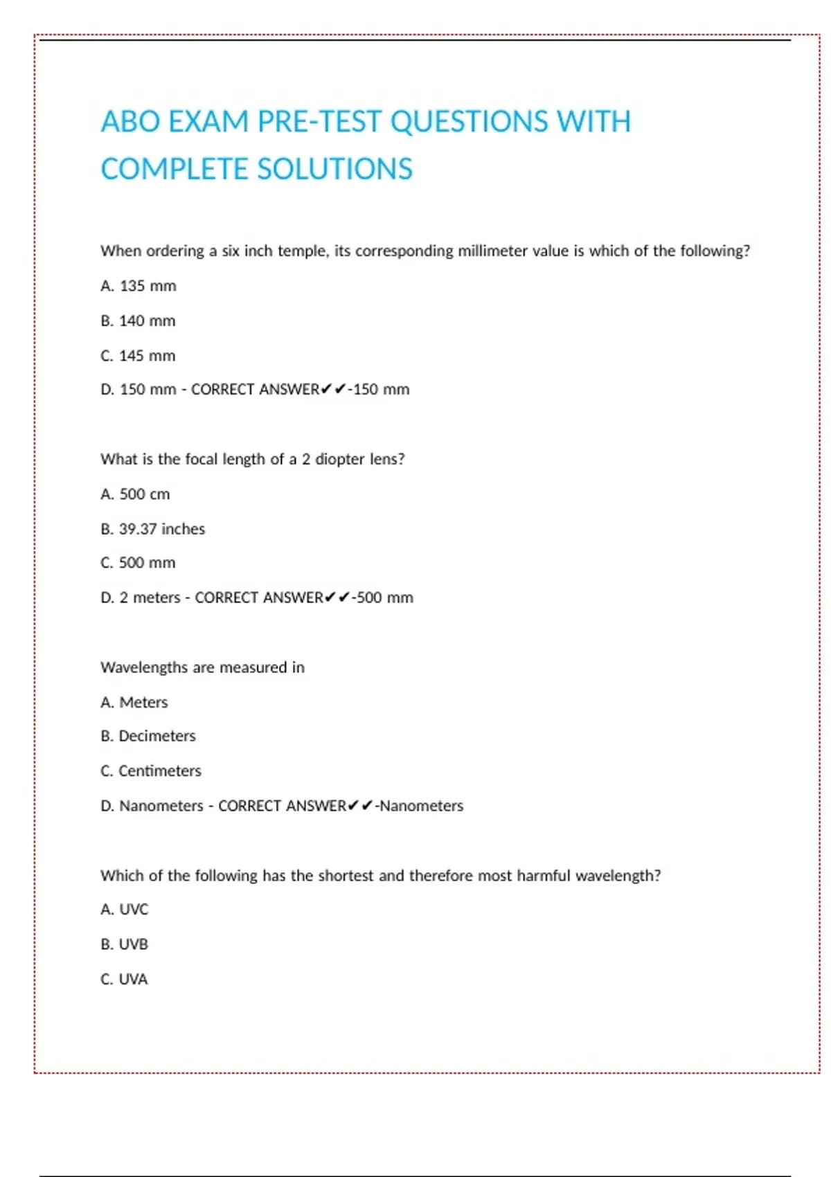 ABO EXAM PRE-TEST QUESTIONS WITH COMPLETE SOLUTIONS