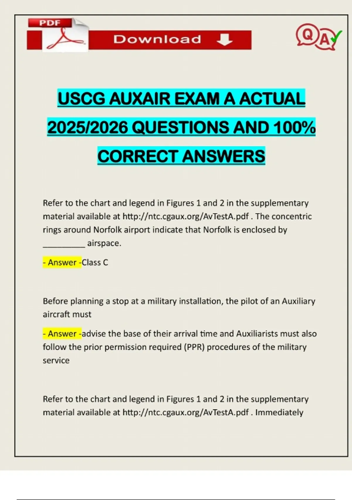 USCG AUXAIR EXAM A ACTUAL 2025/2026 QUESTIONS AND 100% CORRECT ANSWERS Refer to the chart and legend in Figures 1 and 2 in the supplementary material available at rings around Norfolk airport indicate that Norfolk is enclosed by _________ airspace. - Answer -Class C Before planning a stop at a military installation, the pilot of an Auxiliary aircraft must - Answer -advise the base of their arrival time and Auxiliarists must also follow the prior permission required (PPR) procedures of the military service Refer to the chart and legend in Figures 1 and 2 in the supplementary material available at Full Course Assistance, Plagiarism-free Essay Writing, Research Paper, Dissertation, Discussion Posts, etc…. Confidential & Secure services. Tutors are available for all subjects! Email now at: North of the Northeast-Southwest runway at ORF is a tower that rises to - Answer -146 f msl The official designated to coordinate and control a specific SAR mission is the - Answer -SMC