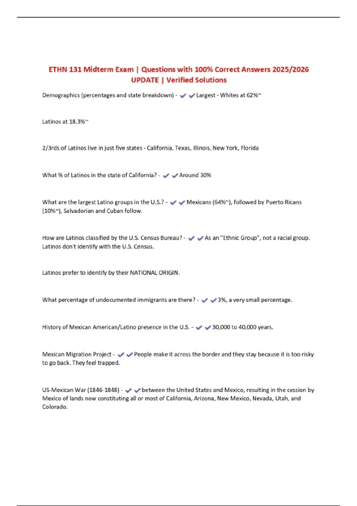 ETHN 131 Midterm Exam | Questions with 100% Correct Answers 2025/2026 UPDATE | Verified Solutions