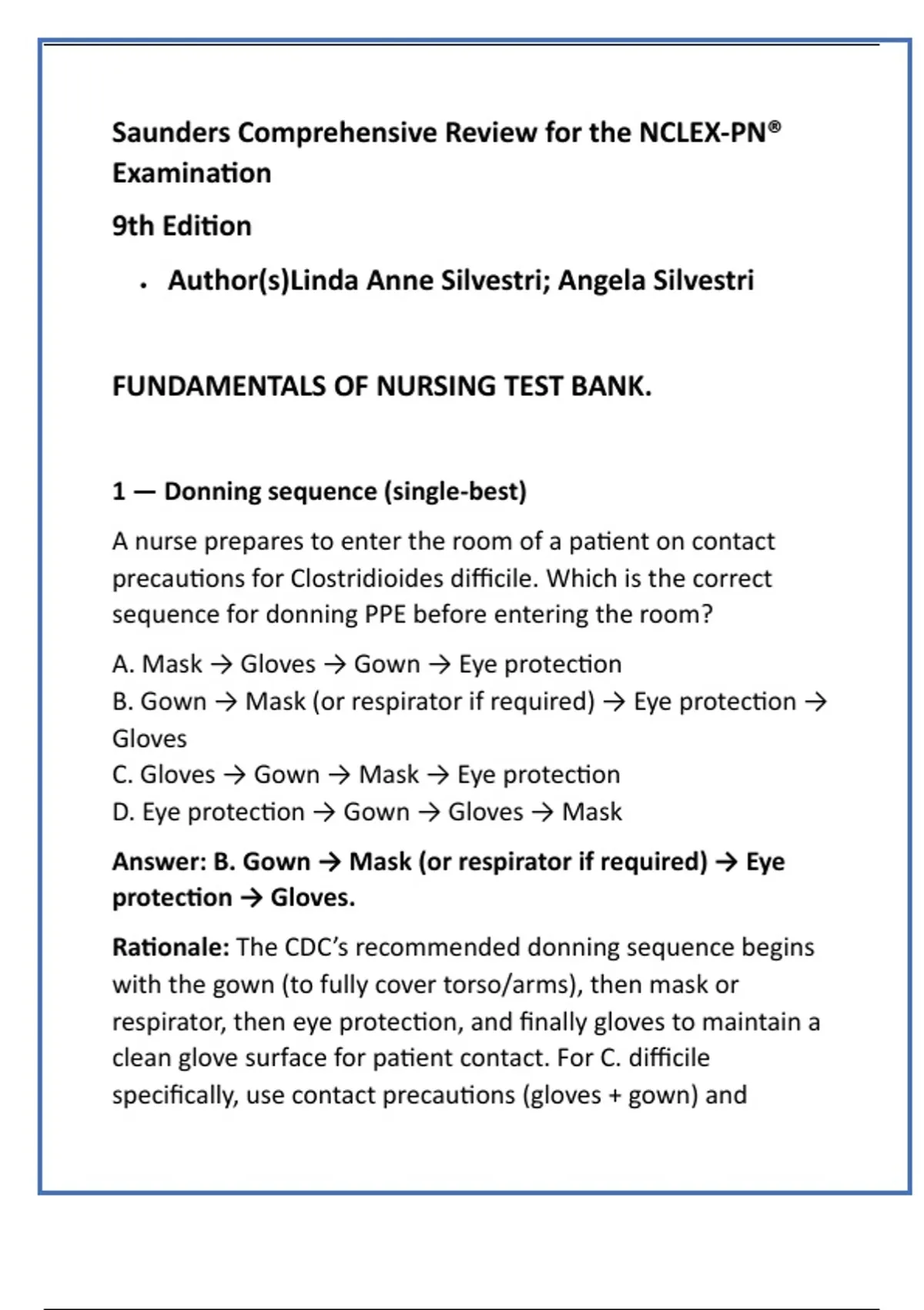 Saunders NCLEX-RN Fundamentals Mastery | 2025 Review Questions, Infection Control, Safety, Delegation & Communication Test Bank with Rationales Meta Description (177 characters) Master NCLEX-RN Fundamentals with 2025-aligned questions, rationales, and clinical judgment cases. Perfect for nursing students, educators, and test prep success. Product Description (≈560 words) Overview Unlock your full NCLEX-RN potential with this original, high-yield Fundamentals of Nursing test bank, expertly developed from the Saunders Comprehensive Review for the NCLEX-RN Examination (Latest Edition). Designed by nurse educators and NCLEX item writers, this collection provides evidence-based questions, detailed rationales, and professional formatting that mirror real NCLEX exam standards — preparing you for mastery, not just memorization. Aligned with the 2025 NCLEX-RN Test Plan, this resource covers the most essential foundational competencies every nurse must master: infection control, client care skills, safety, communication, documentation, delegation, and prioritization. Each item integrates clinical judgment scenarios using the NCSBN Clinical Judgment Measurement Model (CJMM) — ensuring you can think like a nurse under pressure. What’s Inside 150+ original NCLEX-style fundamentals questions written by nurse educators with item-writing expertise. Detailed rationales for both correct and incorrect answers — promoting deeper understanding, not guesswork. PPE sequencing and isolation precautions aligned with CDC standards. Core nursing skills: hygiene, vital signs, elimination, feeding, positioning, and comfort measures. Safety, SBAR communication, HIPAA compliance, and professional documentation essentials. Delegation and prioritization mastery grounded in the Clinical Judgment Measurement Model. Lab interpretation and patient education integrated throughout for holistic critical thinking. Professional formatting ideal for classroom use, simulation labs, or independent NCLEX preparation. Why It Matters The NCLEX is no longer about recall — it tests how you apply nursing judgment in real-world situations. This Saunders-based fundamentals test bank bridges the gap between knowledge and action, empowering you to: Recognize early warning signs, prioritize care, and prevent errors. Apply infection control and safety principles with confidence. Communicate effectively using SBAR while maintaining HIPAA compliance. Delegate and evaluate care across interdisciplinary teams. Build endurance and confidence with authentic NCLEX-style practice. ‍⚕️ Perfect For Nursing students preparing for the NCLEX-RN or in fundamentals courses. Educators seeking reliable classroom test items and review materials. NCLEX tutors and reviewers designing mock exams and simulations. Learning Outcomes After completing this test bank, learners will be able to: Implement CDC-compliant infection control practices. Demonstrate safe, evidence-based client care skills. Use professional communication and documentation techniques. Prioritize and delegate nursing tasks using sound clinical reasoning. Apply patient education strategies to promote optimal outcomes. Invest in Your Success Master the fundamentals that define professional nursing excellence. Whether you’re building your foundation or refining your clinical judgment for the 2025 NCLEX, this resource offers the clarity, confidence, and competence to pass with distinction. Download instantly — study smarter, think critically, and step into your NCLEX exam fully prepared. Top 20 SEO Keywords Saunders NCLEX-RN review NCLEX fundamentals questions Nursing test bank fundamentals NCLEX practice questions 2025 Infection control NCLEX PPE sequencing nursing Isolation precautions nursing NCLEX safety communication SBAR documentation nursing HIPAA nursing practice Nursing delegation prioritization Clinical Judgment Measurement Model NCLEX Fundamentals of nursing NCLEX review NCLEX rationales test bank Nursing skills hygiene vital signs NCLEX-RN practice exam PDF Nurse educator test bank Patient education NCLEX questions NCLEX lab interpretation fundamentals High-yield nursing exam prep Hashtags (20) #NCLEXPrep #NursingStudents #SaundersReview #FundamentalsofNursing #NCLEX2025 #NursingEducation #NurseLife #NCLEXRN #TestBank #NursingSchool #ClinicalJudgment #InfectionControl #SBAR #HIPAA #NurseEducator #Delegation #PatientSafety #StudyNursing #NCLEXPractice #FutureRN Meta Tags (15) Title Tag: Saunders NCLEX-RN Fundamentals Test Bank 2025 | Infection Control, Safety & Communication Review Description Tag: Master NCLEX-RN Fundamentals with expert-written questions, rationales, and CJMM-aligned prioritization cases for nursing success. Keyword Tag: NCLEX-RN fundamentals, Saunders review, NCLEX 2025, nursing test bank, infection control, SBAR, HIPAA, delegation, prioritization, clinical judgment. Author Tag: Nurse Educator & NCLEX Item Writer Language Tag: English (US) Audience Tag: Nursing Students, Educators, NCLEX Candidates Format Tag: Digital Download / Test Bank PDF Category Tag: Nursing Education / NCLEX Preparation Topic Tag: Fundamentals of Nursing, Infection Control, Delegation Publisher Tag: Academic Nursing Resources Education Level Tag: Undergraduate Nursing / RN Licensure Prep Update Tag: Aligned with 2025 NCLEX-RN Test Plan Feature Tag: Detailed Rationales, CJMM Framework Intent Tag: Learn, Practice, Pass Call-to-Action Tag: Download & Master NCLEX Fundamentals