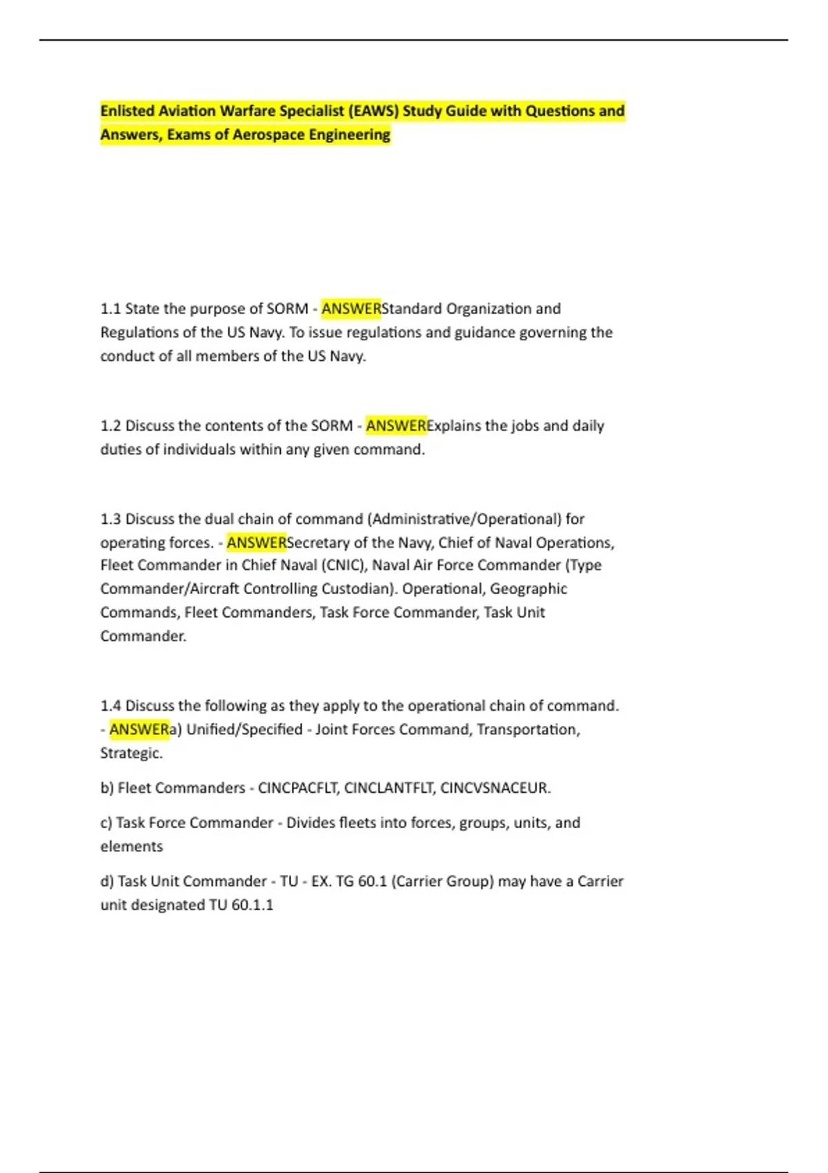 Enlisted Aviation Warfare Specialist (EAWS) Study Guide with Questions and Answers, Exams of Aerospace Engineering