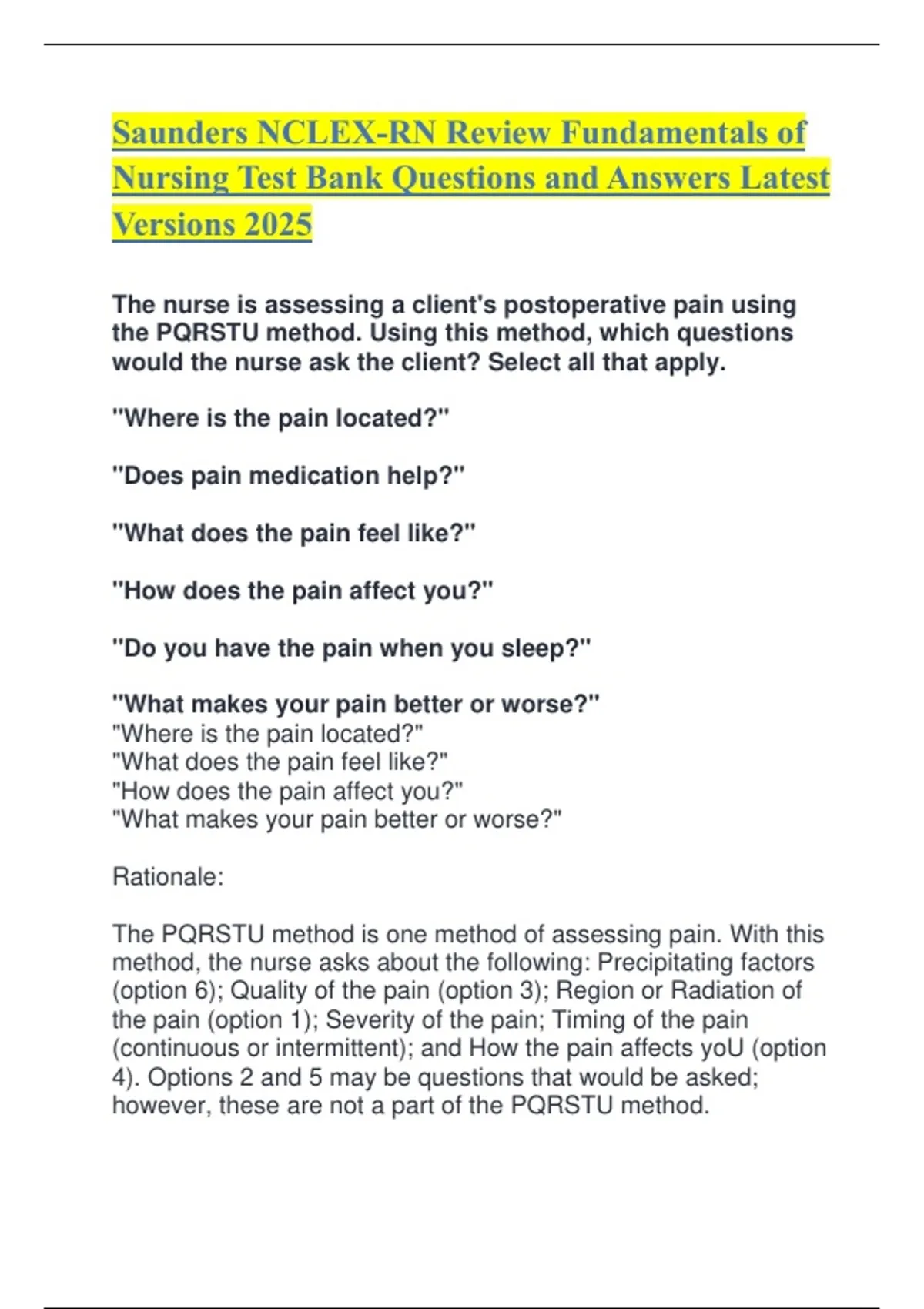 Saunders NCLEX-RN Review Fundamentals of Nursing Test Bank Questions and Answers Latest Versions