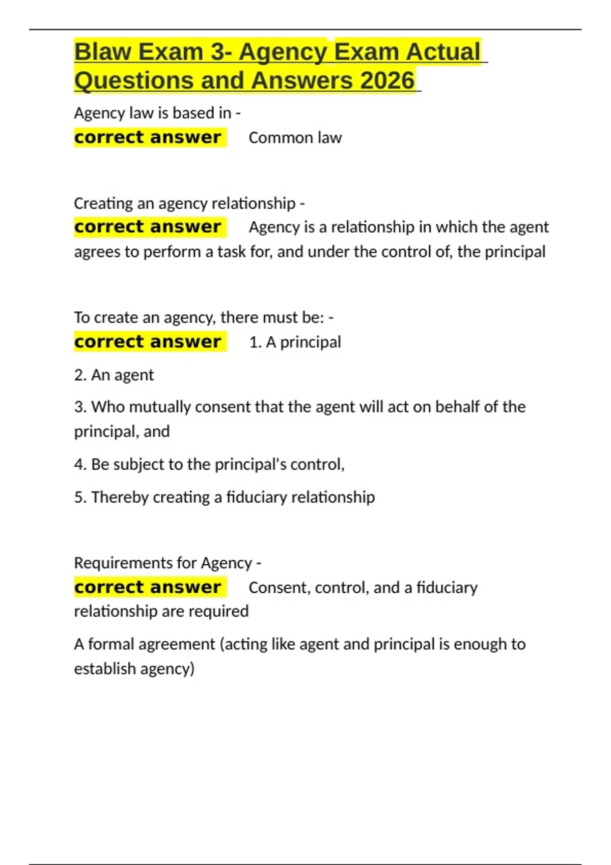 Blaw Exam 3- Agency Exam Actual Questions and Answers