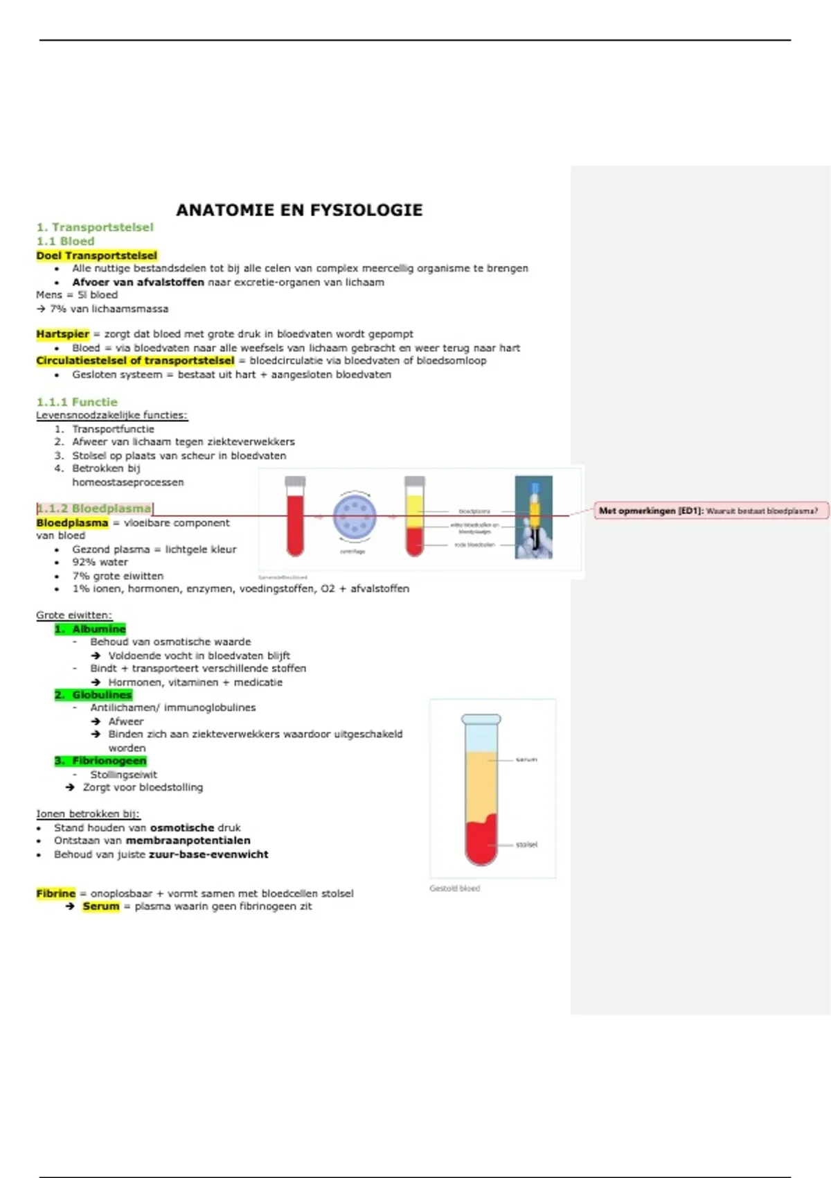 1.1.2 Bloedplasma Met opmerkingen [ED1]: Waaruit bestaat bloedplasma?