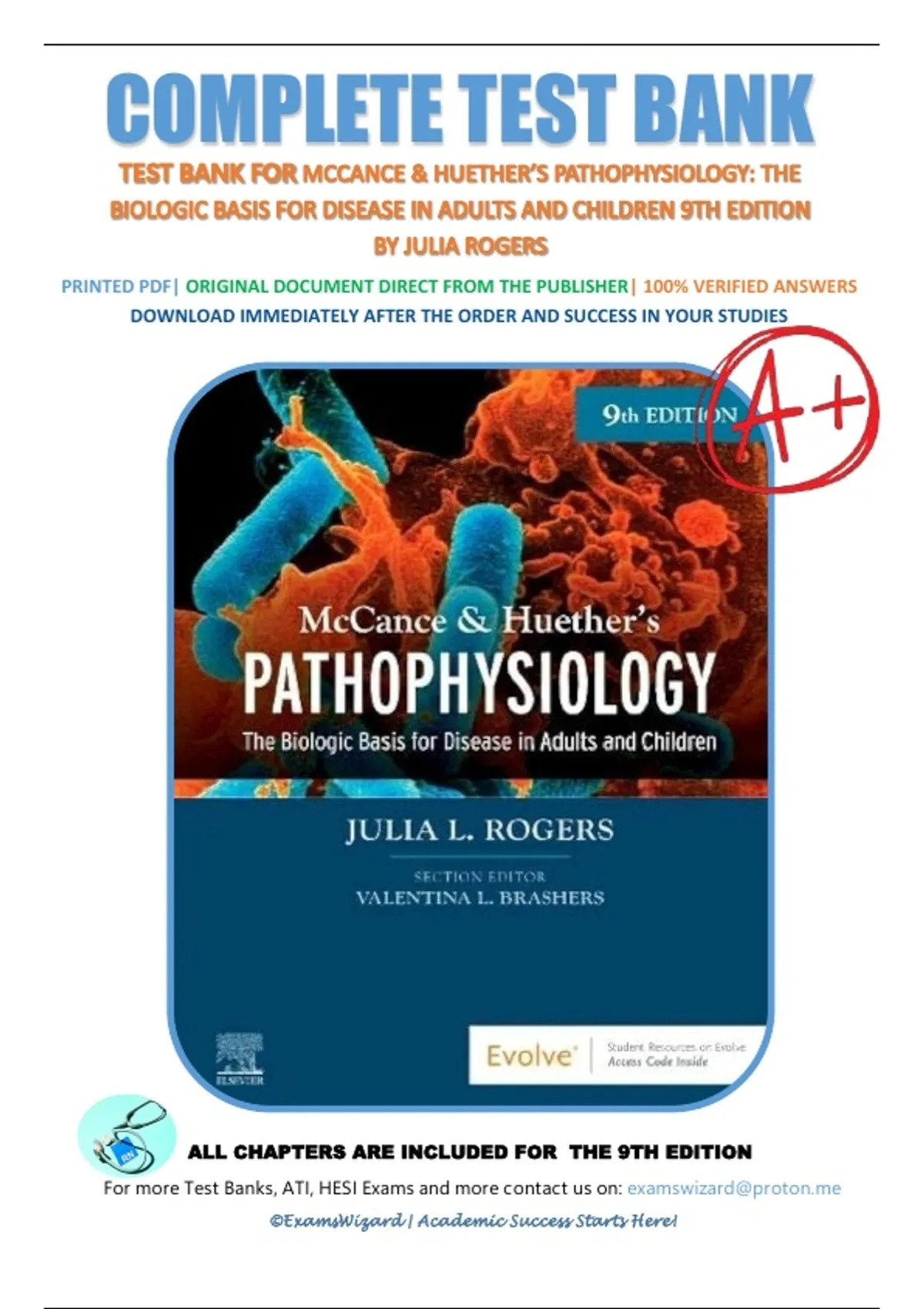This is the COMPLETE Test Bank for McCance & Huether's Pathophysiology: The Biologic Basis for Disease in Adults and Children, 9th Edition. It is an essential, comprehensive study resource for nursing and health science students covering core pathophysiological concepts. The document includes multiple-choice and multiple-response questions for ALL chapters in the 9th Edition. Each question features the correct, 100% verified answer and detailed rationales, making it the most accurate and up-to-date material for rigorous exam preparation and achieving academic success.