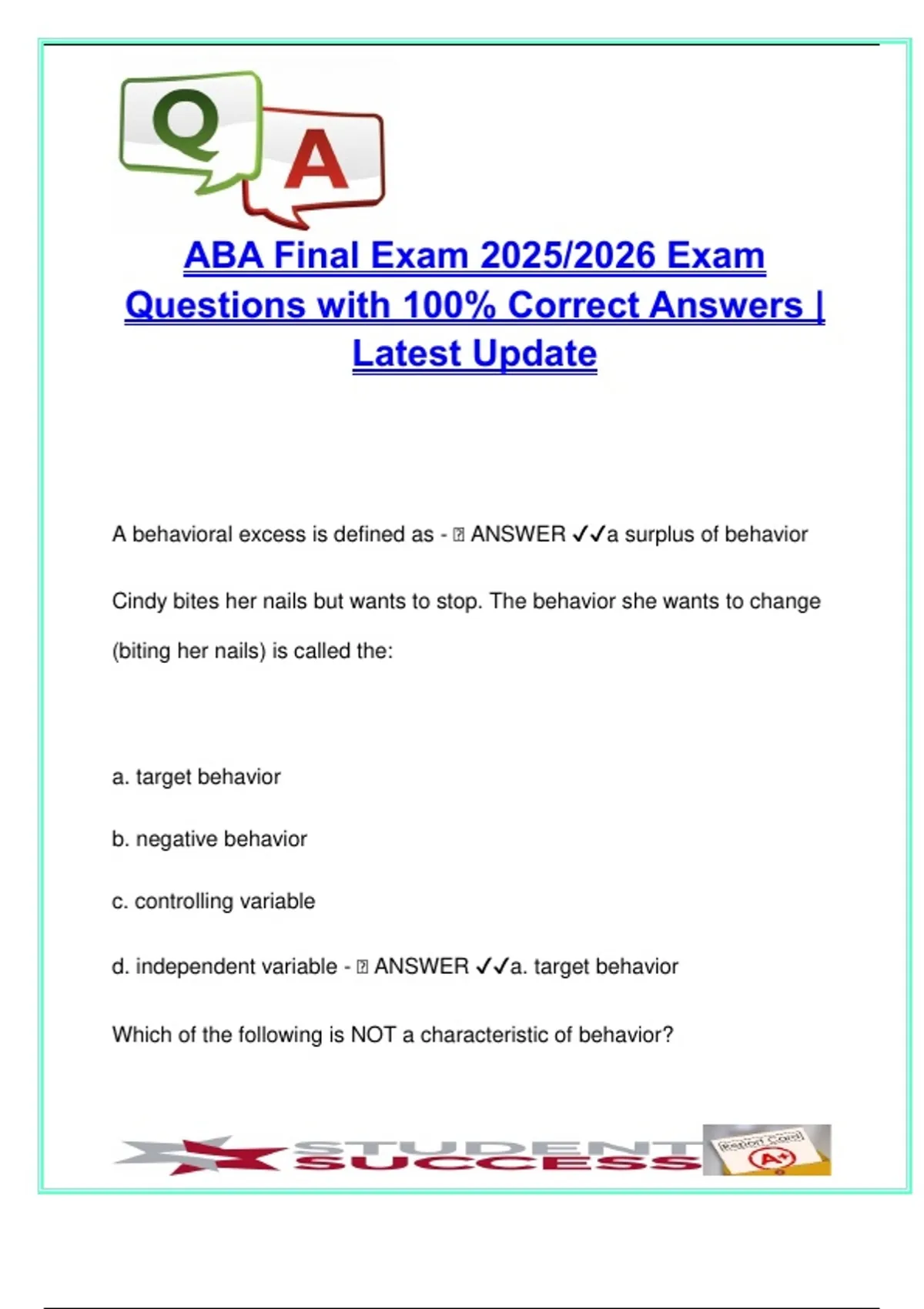 d. independent variable - 🧠 ANSWER ✔✔a. target behavior