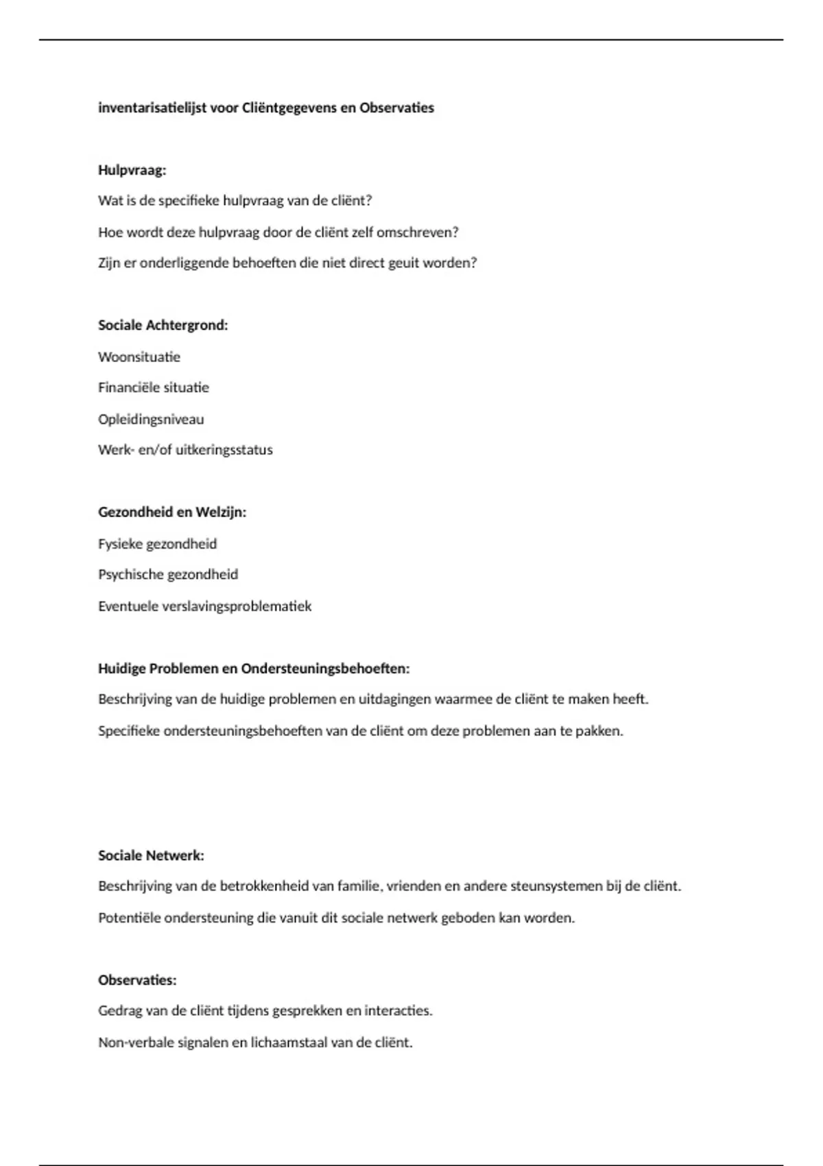 inventarisatielijst voor Cliëntgegevens en Observaties