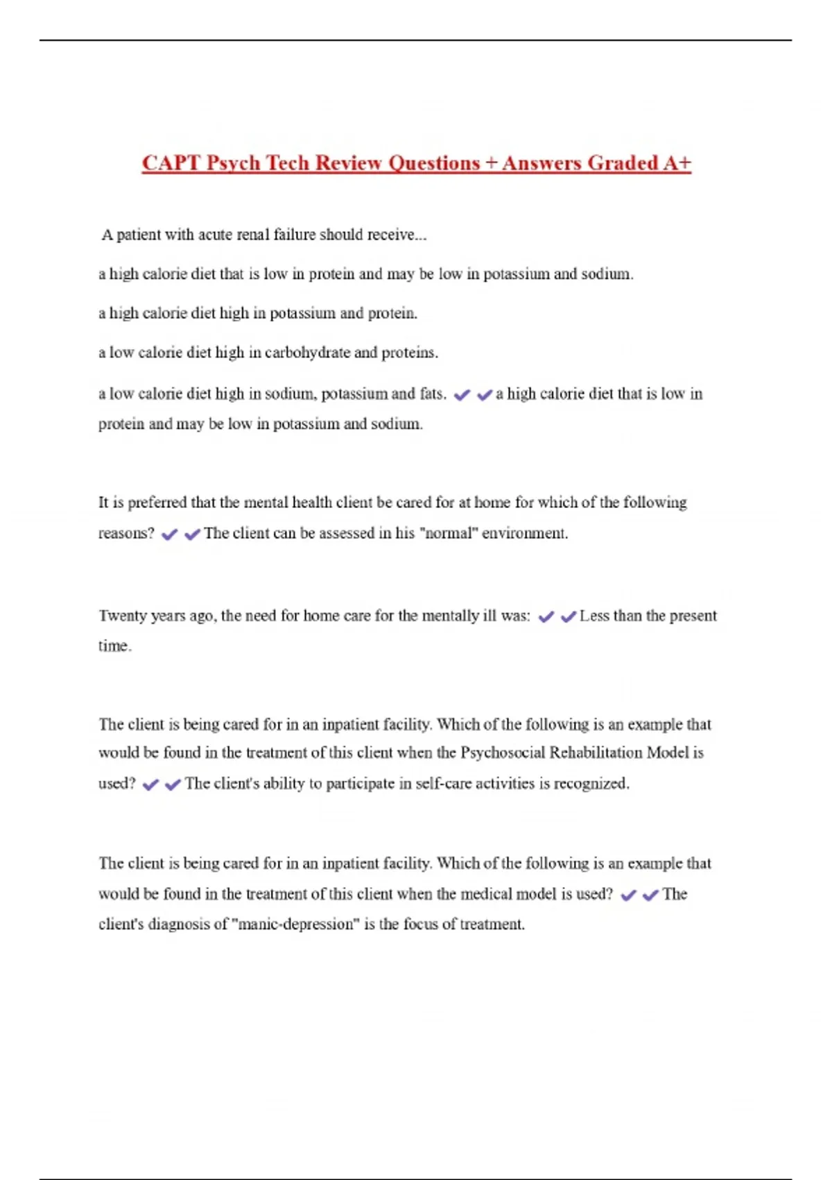 CAPT Psych Tech Review Questions + Answers Graded A+ A patient with acute renal failure should receive... a high calorie diet that is low in protein and may be low in potassium and sodium. a high calorie diet high in potassium and protein. a low calorie diet high in carbohydrate and proteins. a low calorie diet high in sodium, potassium and fats. protein and may be low in potassium and sodium.
