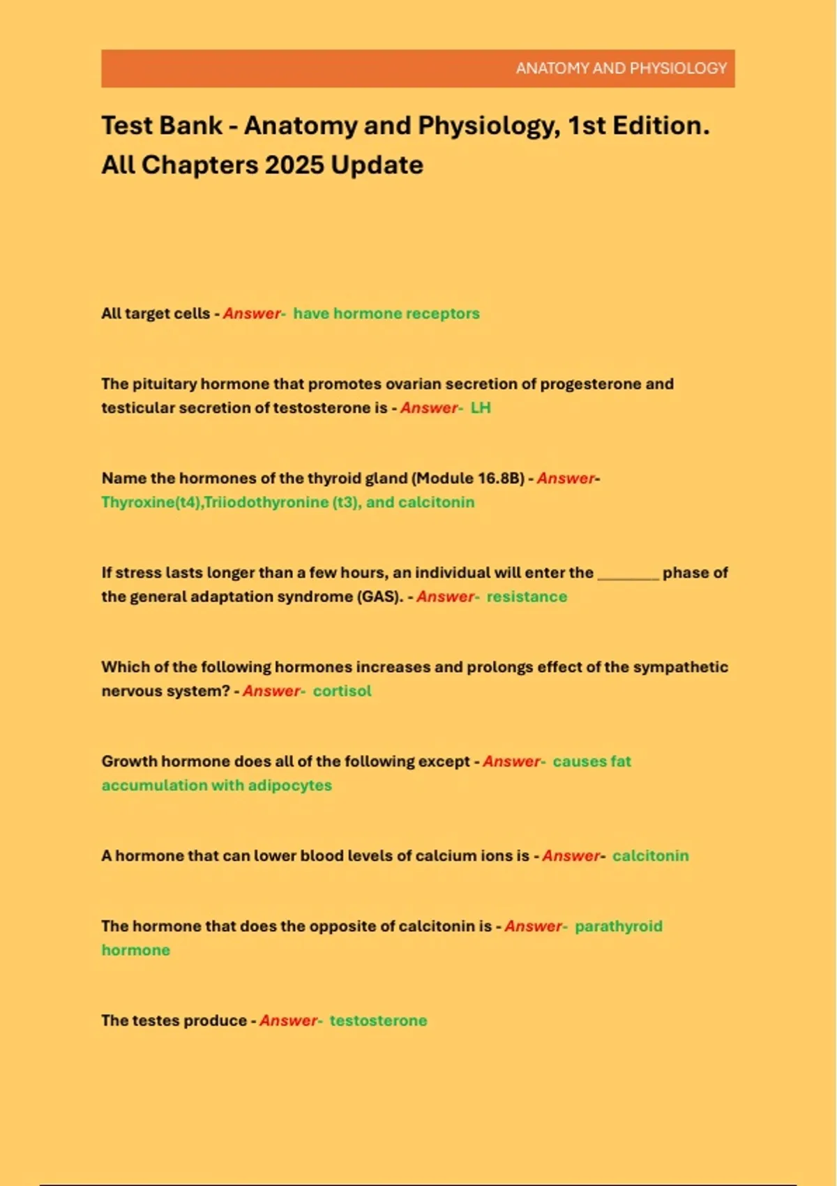 The Anatomy and Physiology Test Bank is a robust academic resource designed to reinforce foundational and advanced concepts in human anatomy and physiology. Covering all major body systems—including cardiovascular, respiratory, musculoskeletal, nervous, endocrine, digestive, and more—this test bank features a diverse range of question formats such as multiple-choice, true/false, labeling, and clinical application scenarios. Each question is paired with accurate answers and clear rationales to support critical thinking and concept mastery. Ideal for nursing, pre-med, and allied health students, this resource is perfect for exam preparation, classroom quizzes, and self-paced review.
