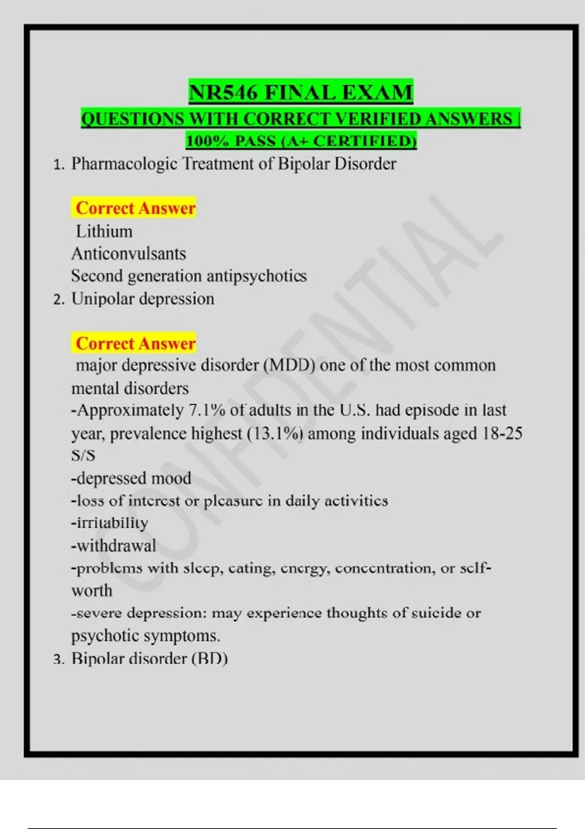 NR546 FINAL EXAM QUESTIONS WITH CORRECT VERIFIED ANSWERS | 100% PASS (A+ CERTIFIED) 1. Pharmacologic Treatment of Bipolar Disorder Correct Answer Lithium Anticonvulsants Second generation antipsychotics 2. Unipolar depression Correct Answer major depressive disorder (MDD) one of the most common mental disorders -Approximately 7.1% of adults in the U.S. had episode in last year, prevalence highest (13.1%) among individuals aged 18-25 S/S -depressed mood -loss of interest or pleasure in daily activities -irritability -withdrawal -problems with sleep, eating, energy, concentration, or self worth -severe depression: may experience thoughts of suicide or psychotic symptoms. 3. Bipolar disorder (BD) Correct Answer Chronic condition characterized by extreme fluctuations in mood, energy, and ability to function -Moods may be manic, hypomanic, or depressed and may include mixed mood or psychotic features -many have only experienced only one manic episode in their lifetime -Mood fluctuations may be separated by periods of high stability or may cycle rapidly -diagnosed when a client has one or more episodes of mania or hypomania with a history of one or more major depressive episodes -high risk for suicide 4. mania Correct Answer characterized by a persistently elevated, expansive, or irritable mood. Related symptoms may include inflated self-esteem, increased goal-directed activity or energy, including grandiosity, decreased need for sleep, excessive talkativeness, racing thoughts, flight of ideas (FOI), distractibility, psychomotor agitation, and a propensity to be involved in high-risk activities. Mania leads to significant functional impairment and may include psychotic features or necessitate hospitalization 5. Bipolar Type I Correct Answer requires at least one episode of mania for at least one week (or any duration if hospitalization due to symptoms is required) 6. Bipolar Type II Correct Answer diagnosis requires a current or past hypomanic episode and a current or past major depressive episode. Symptoms last for at least 4 days but fewer than seven. -Hypomanic symptoms are not of sufficient duration or severity to cause significant functional impairment, psychosis, or hospitalization. -Anger and irritability are common. -Clients often enjoy the elevation of mood and are reluctant to report these symptoms, making bipolar more difficult to diagnose if the client presents in the depression phase. 7. Cyclothymia Correct Answer involves the chronic presentation of hypomanic and depressive symptoms that do not meet the diagnostic criteria for a major depressive or manic/hypomanic episode. 8. If bipolar depression is mistaken for MDD Correct Answer antidepressant therapy may precipitate a manic episode or induce rapid-cycling bipolar depression -may contribute to the increased incidence of death by suicide in children and adults younger than 25 9. Antidepressants are used cautiously in clients with bipolar disorder and never as ________________ Correct Answer monotherapy -Antidepressants should be combined with a mood stabilizer to prevent the onset of a hypomanic or manic episode 10. DA, NE Dysfunction causes what mood related symptoms Correct Answer Decreased positive affect: depressed mood loss of joy lack of interest loss of energy decreased alertness decreased self-confidence appetite changes 11. 5HT, NE Dysfunction causes what mood related symptoms Correct Answer Increased negative affect: depressed mood guilt fear/anxiety hostility irritability loneliness appetite changes 12. monoamine hypothesis of depression Correct Answer depression occurs as a result of a deficiency of one or all three monoamine transmitters • serotonin, norepinephrine, and dopamine -while mania may result from an excess 13. Medication Management for Depression, First-Line Treatment Correct Answer • Selective Serotonin Reuptake Inhibitors (SSRIs) • Serotonin Norepinephrine Reuptake Inhibitors (SNRIs) • Norepinephrine Dopamine Reuptake Inhibitors (NDRI) • Serotonin Antagonist and Reuptake Inhibitors (SARIs) 14. SSRI's Correct Answer Mechanism of action • inhibit 5-HT reuptake Adverse effects -diarrhea -headache -weight gain -sexual side effects 15. SNRI's Correct Answer Mechanism of action • inhibit 5-HT reuptake • inhibit NE reuptake (increase energy, focus) • increase DA in prefrontal cortex (increase cognition) Adverse effects -elevated blood pressure -anxiety -insomnia -constipation 16. NDRI's Correct Answer Mechanism of action • inhibit DA reuptake (increase alertness, motivation) • inhibit NE reuptake (increase energy) Adverse effects -agitation -headache -dry mouth -constipation -weight loss 17. SSRI Prescribing Pearls Correct Answer med with mild antihistamine effects: citalopram (Celexa) 18. SSRI Prescribing Pearls Correct Answer med with no known drug interactions: escitalopram (Lexapro) 19. SSRI Prescribing Pearls Correct Answer med with longest half-life: fluoxetine (Prozac) 20. SSRI Prescribing Pearls Correct Answer med that also treats social anxiety and insomnia: paroxetine (Paxil) 21. SSRI Prescribing Pearls Correct Answer med that treats anxious depression; smokers require an increased dose: fluvoxamine (Luvox) 22. SSRI Prescribing Pearls Correct Answer med that also treats social anxiety and hypersomnolence: sertraline (Zoloft) 23. venlafaxine (Effexor) Correct Answer INDICATION -Depression -GAD -Social anxiety disorder -Panic disorder Mechanism of Action -SNRI (dual serotonin and norepinephrine reuptake inhibitor), Boosts neurotransmitters serotonin, norepinephrine/noradrenaline, and dopamine. TESTS -Check bp before initiating tx & regularly during tx Starting Dose -Initial 37.5 mg daily (extended-release) or 25-50 mg divided into 2-3 doses (immediate-release) Adverse Effects -H/A, nervousness, insomnia, sedation, nausea, diarrhea, decreased appetite, sexual dysfunction, asthenia, sweating, SIADH, hyponatremia, increase BP PEARLS -treats both depression and anxiety disorders, ens